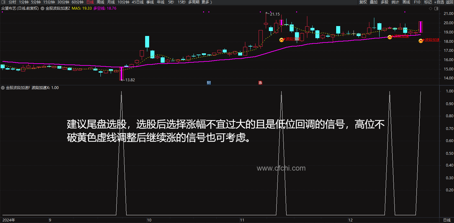 2.尾盘选股,选股后选择涨幅不宜过大的且是低位回调的信号,高位不破黄色虚线调整后继续涨的信号也可考虑。