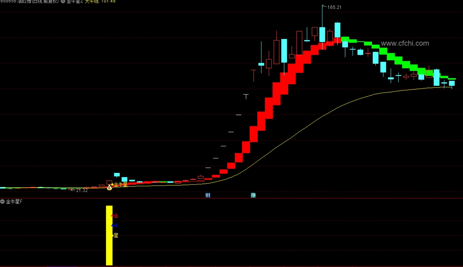 3、为了更全面地捕捉市场动态,“金牛星”指标还引入了动量分析和散度指标。它们共同构成了“绿散”和“红主”两个动量指标 ,分别代表了市场的悲观和乐观情绪。