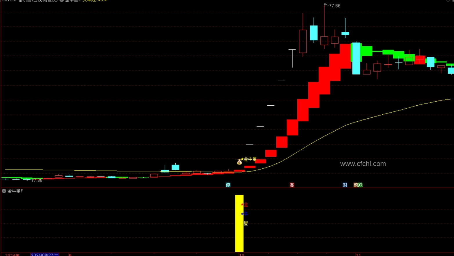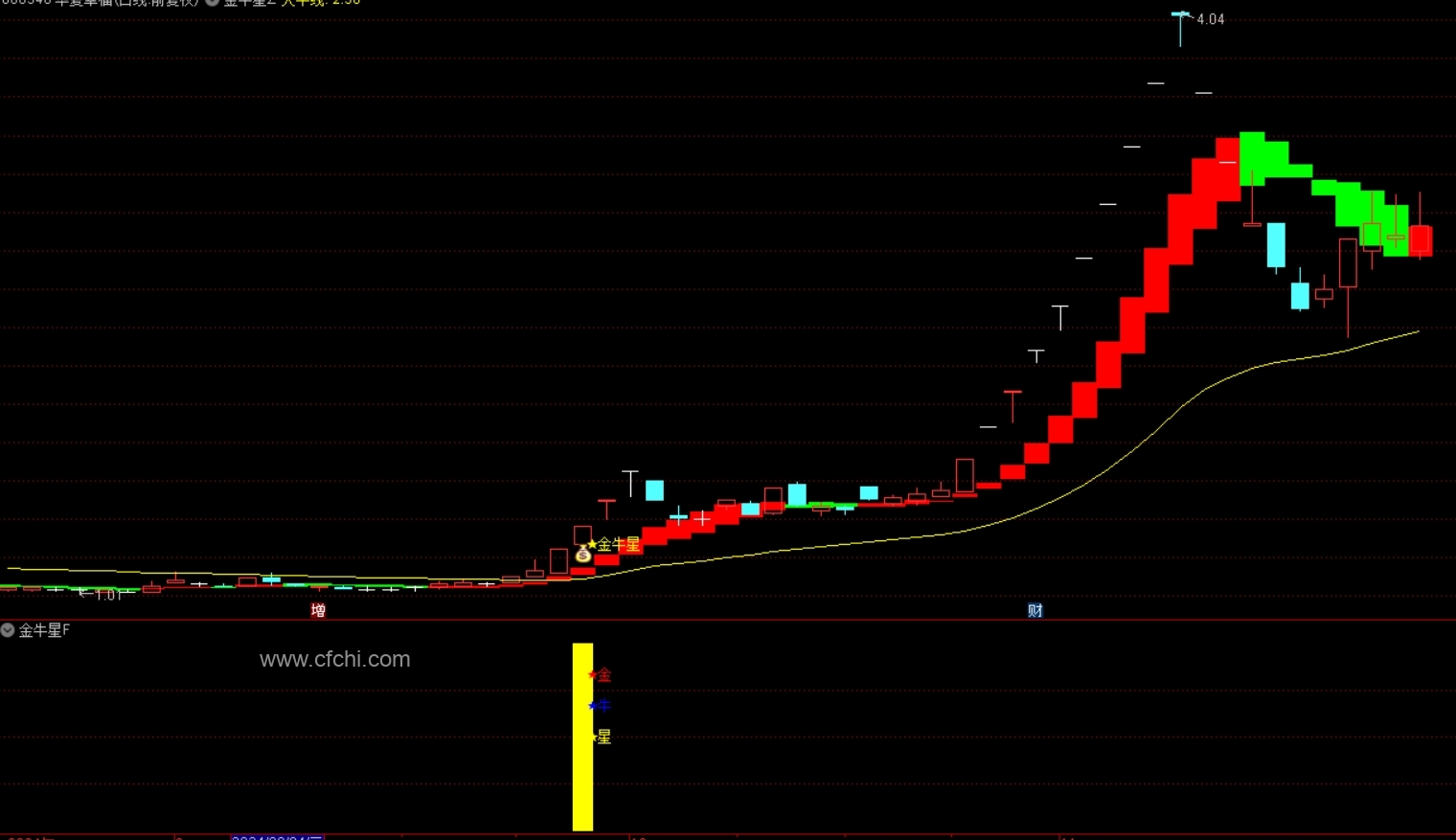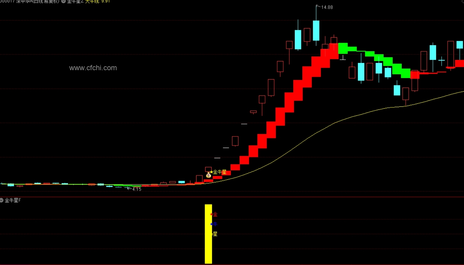 4、指标的亮点在于其独特的“小牛”信号。这里的“小牛线”是一个动态调整的市场适应性指标。当“小牛”信号出现,伴随着一个特制的金色星星图标以及“★金牛星”(选股信号)的文字标注,标志着潜在的投资机会。