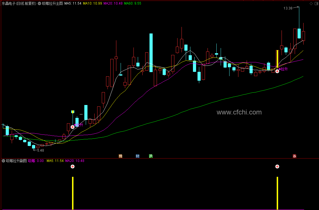 4、副图指标:当副图指标出现紫色柱信号时,表示"吸筹"动作开始;当副图指标出现黄色柱信号与红色十字信号时,表示"拉升"动作开始。