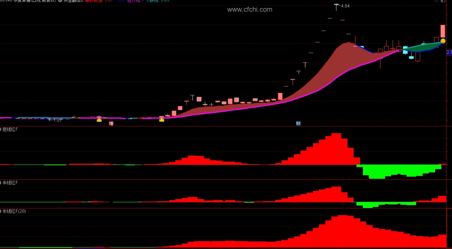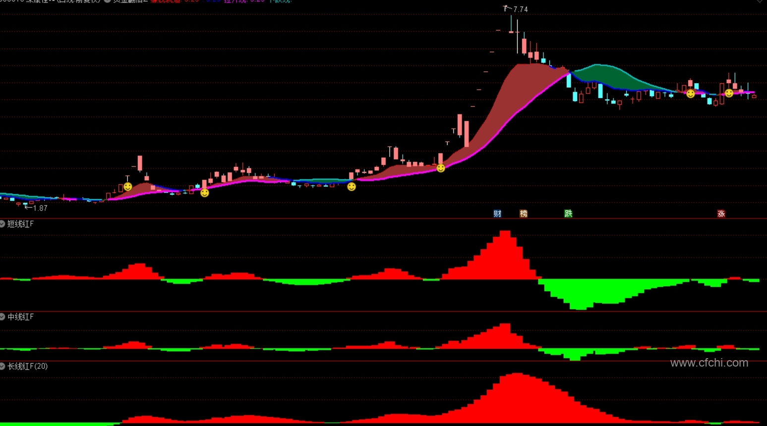 2、结合EMA差值、价格波动幅度及市场情绪分析,形成一套完整的买入信号系统。当短线、中线及长线指标同时发出买入信号时,指标将在主图上显示“笑脸”图标,并伴随特定的颜色变化(如淡红色K线),这标志着主力资金已共振入场,为大家提供了明确的买入时机。
