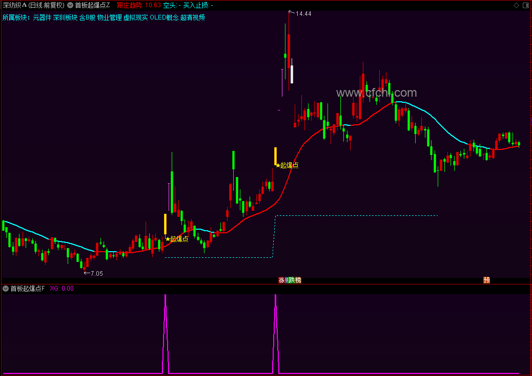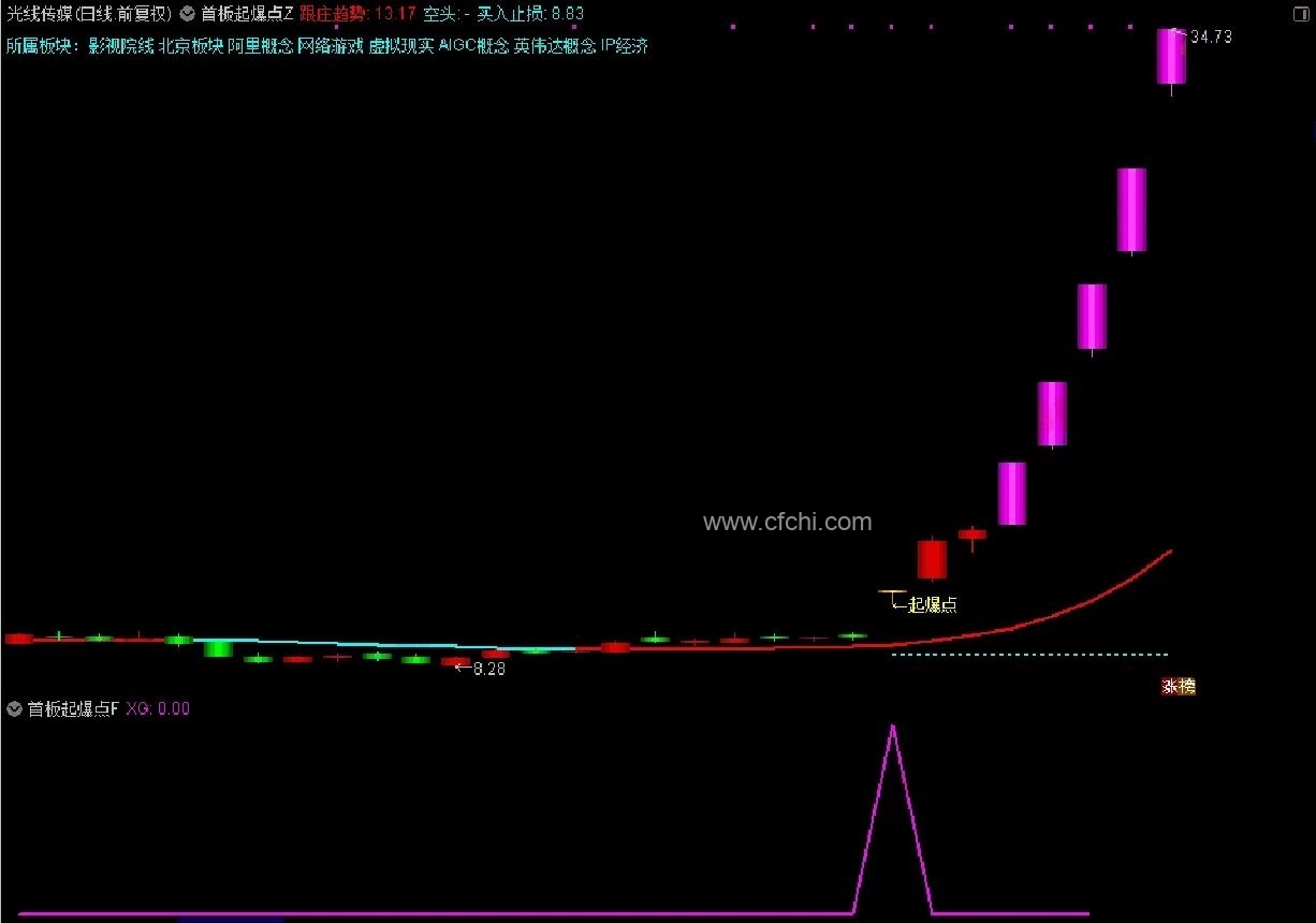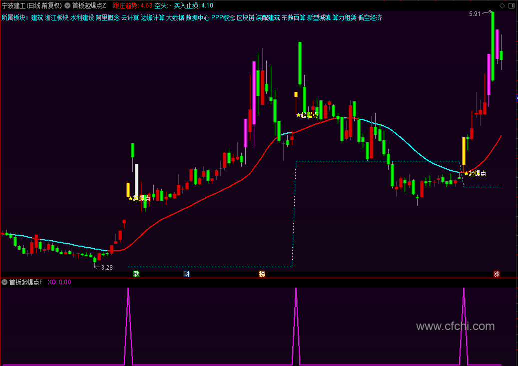7、涨停板以淡紫色特别标注,跌停板则呈现为灰白色,“起爆点”信号的K线以黄色高亮显示,并辅以起爆点标注;