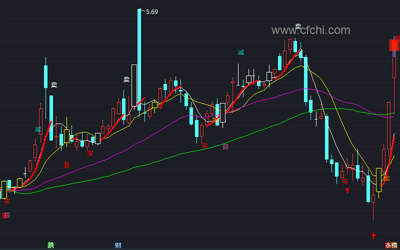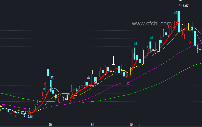 • 波段底:计算价格相对位置的5日加权移动平均,减去其3日加权移动平均的2倍。
