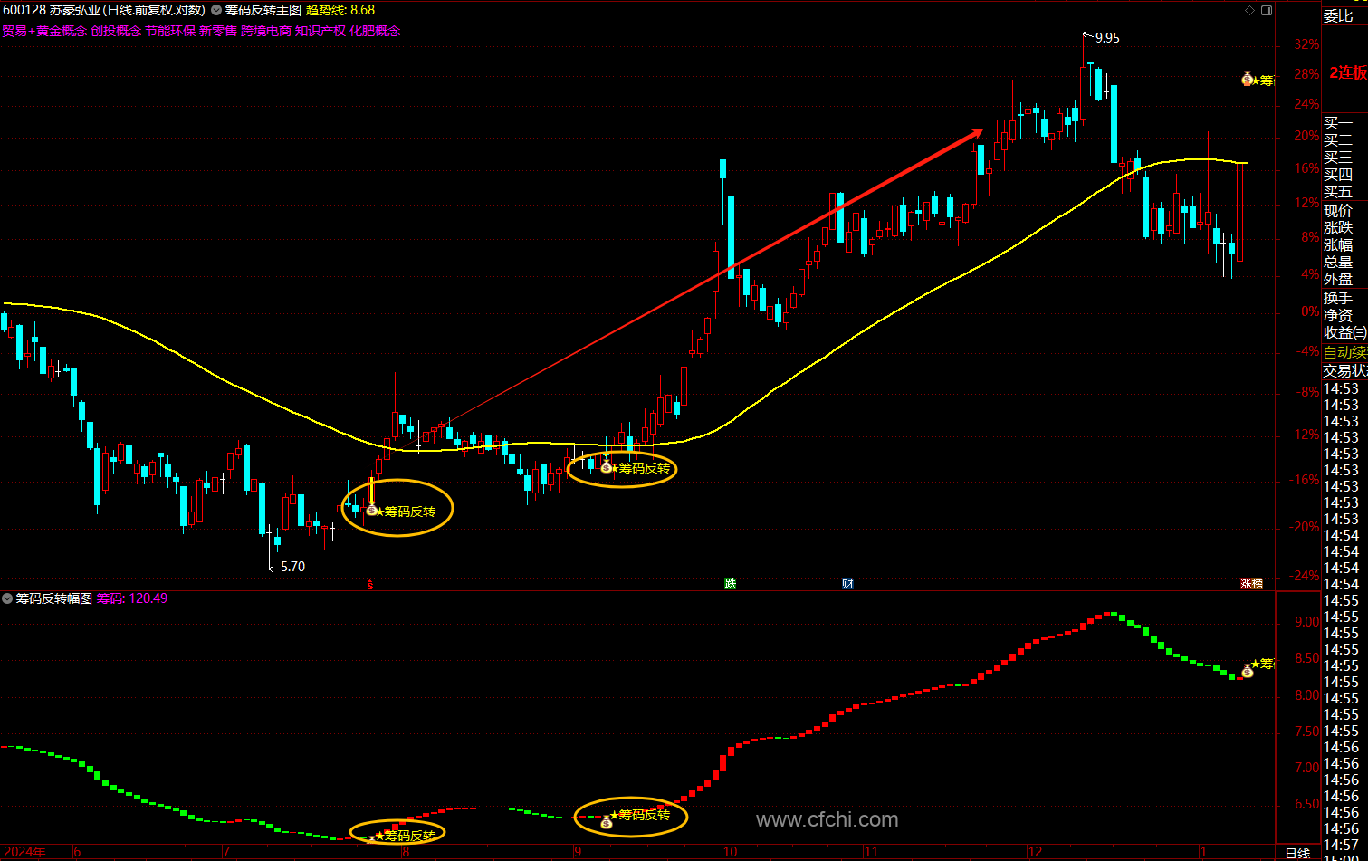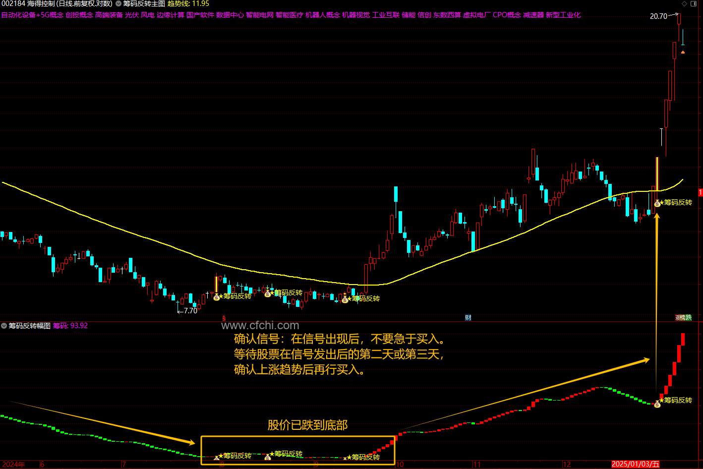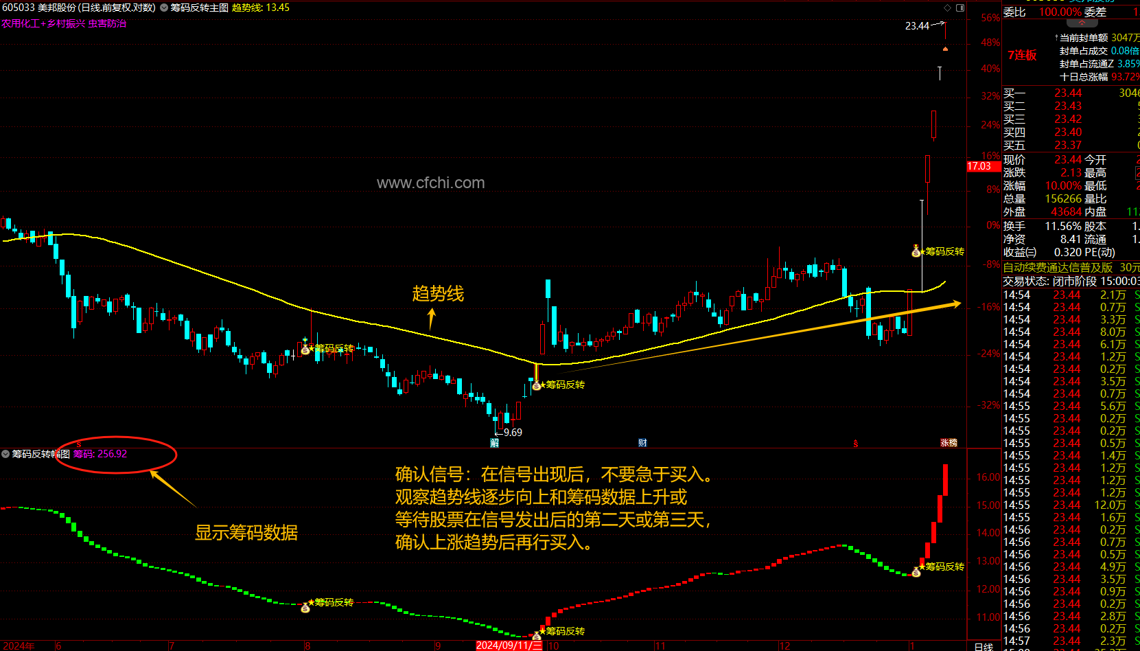幅图筹码数据是否上升逐步变为正数等,等待股票在信号发出后的第二天或第三天,确认上涨趋势后再行买入。
