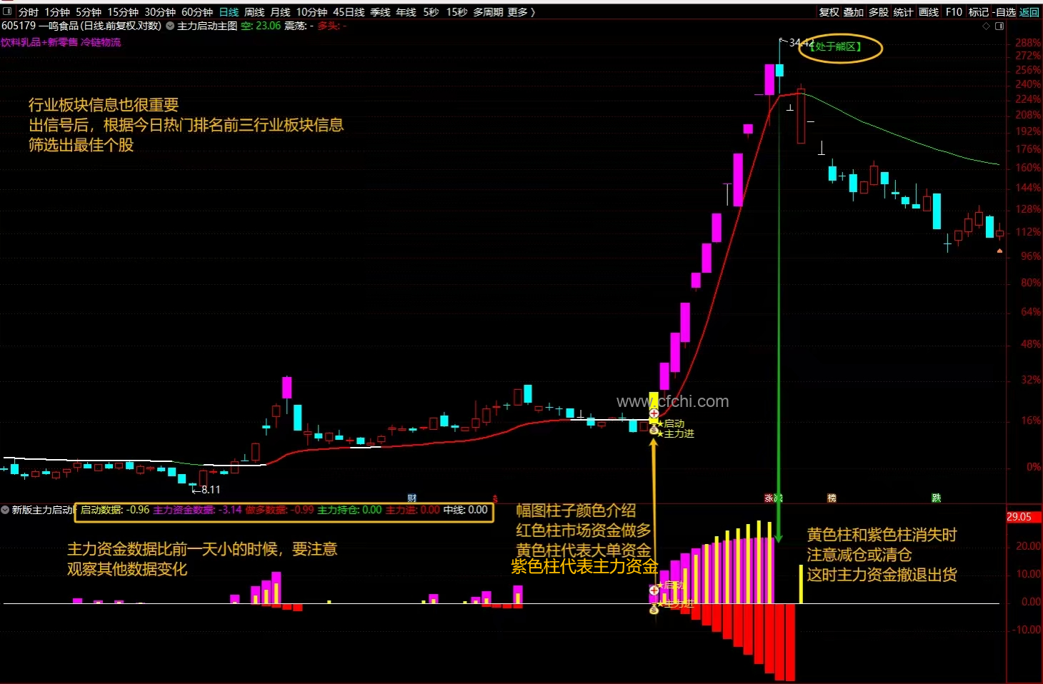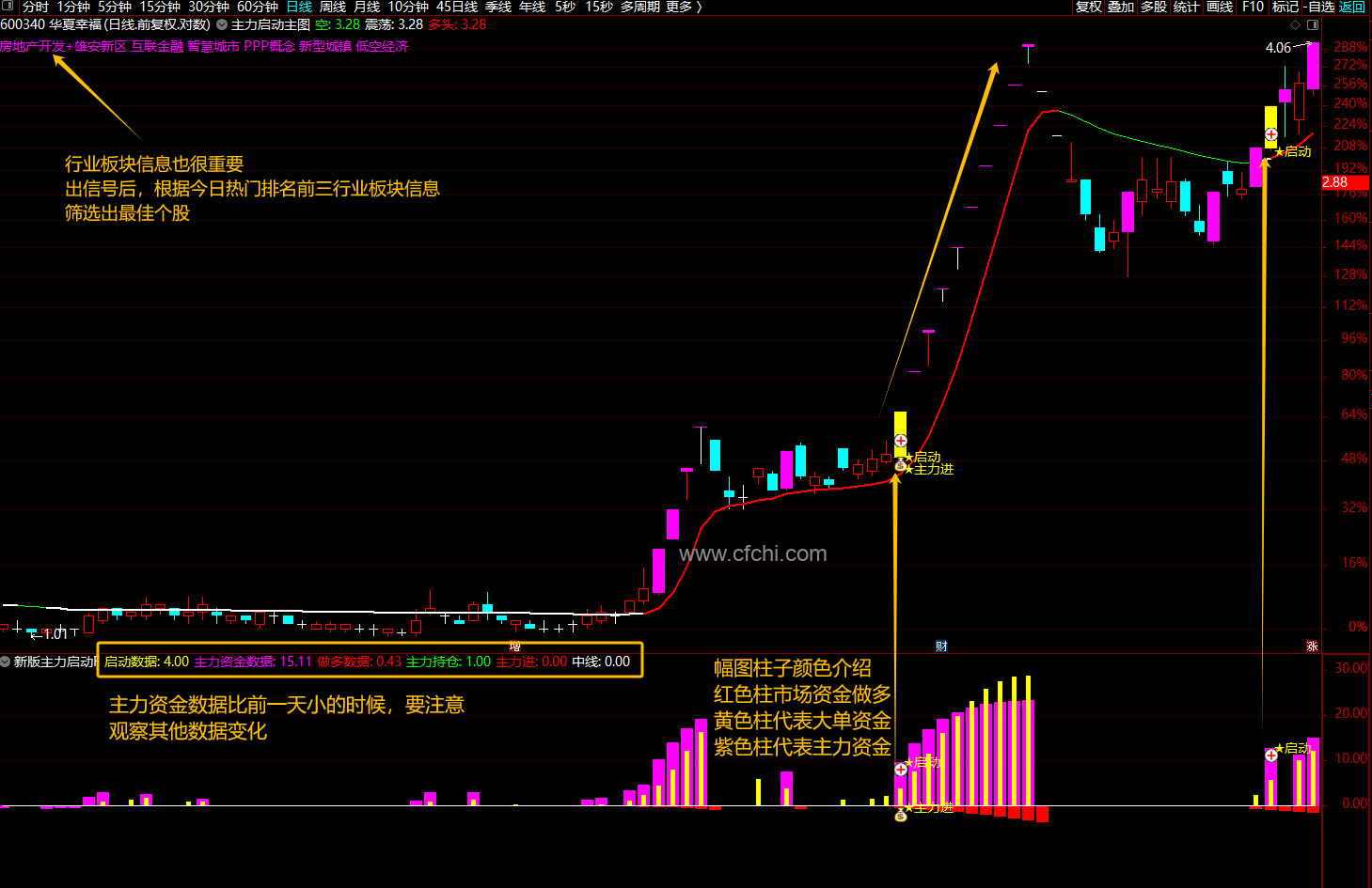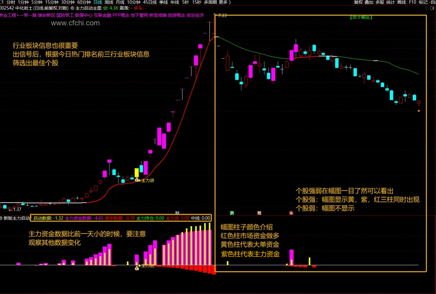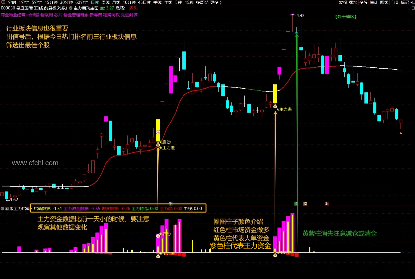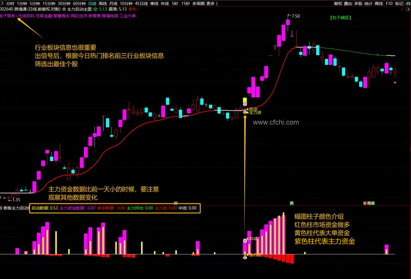 4、幅图柱子颜色介绍:红色柱市场资金做多、黄色柱代表大单资金、紫色柱代表主力资金,