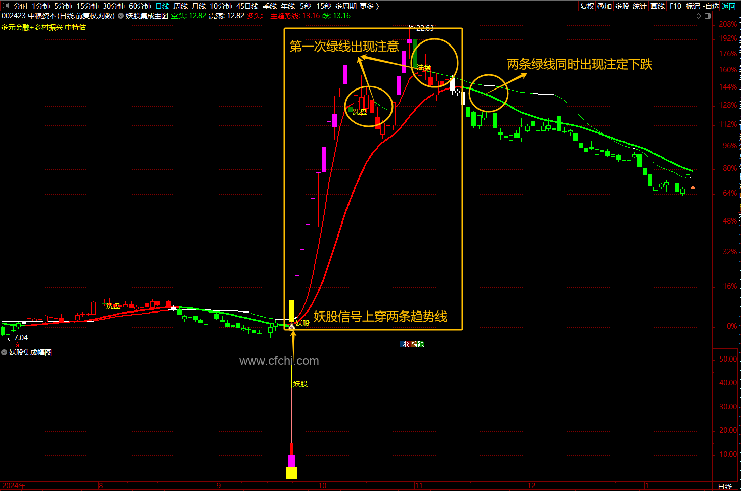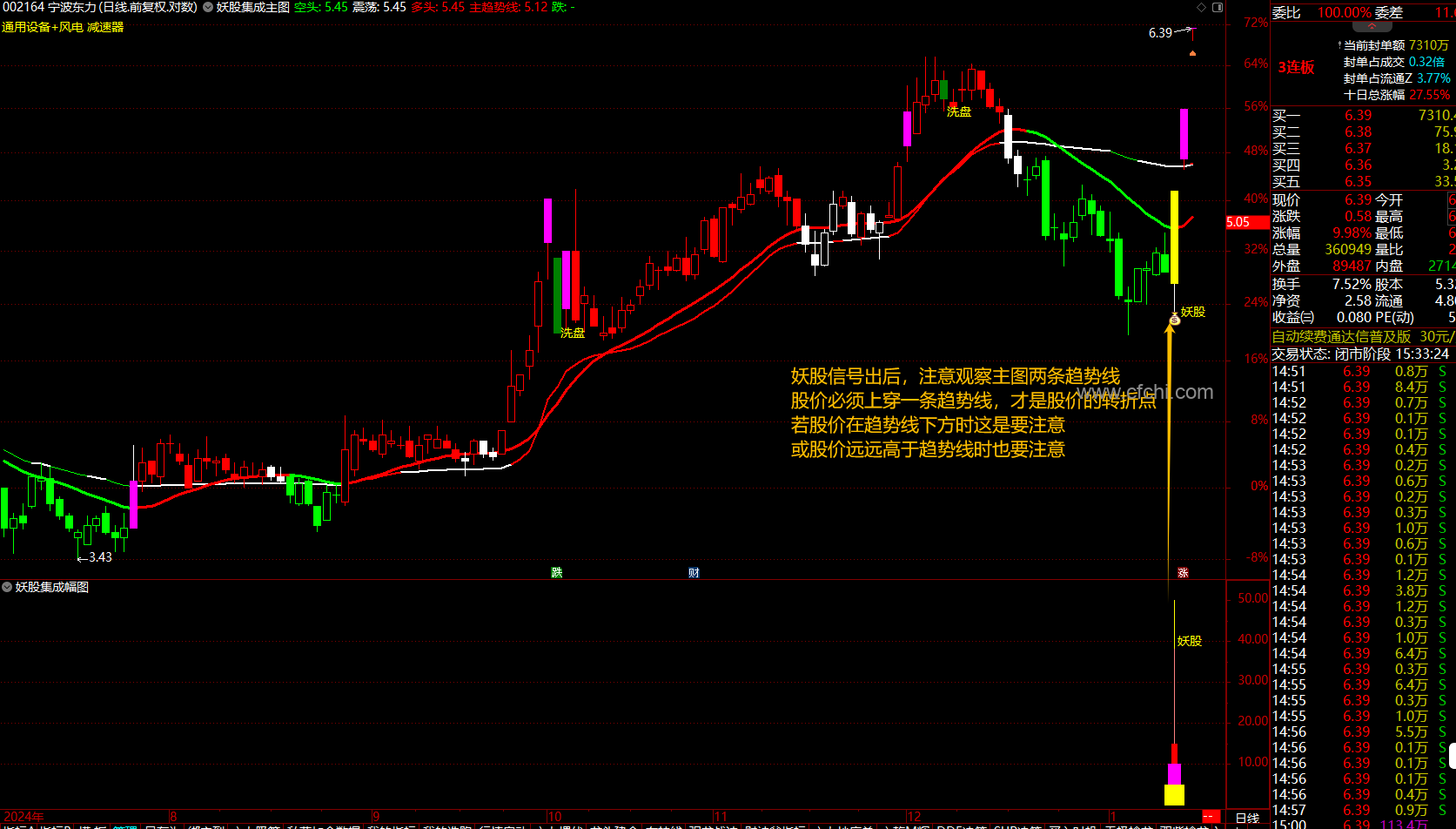 6、妖股信号出后,注意观察主图两条趋势线股价必须上穿一条趋势线,才是股价的转折点,若股价在趋势线下方