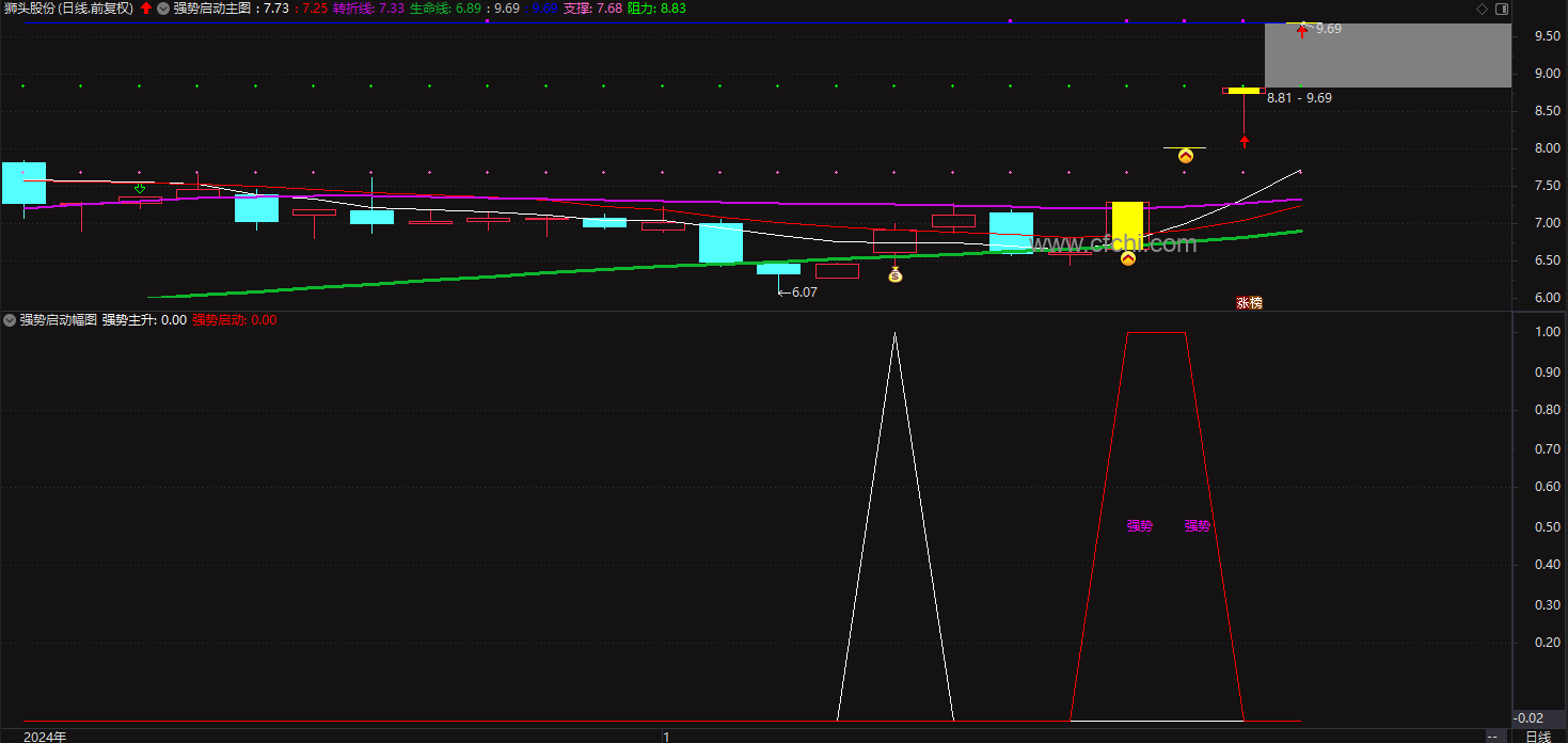 指标含主、副图/选股预警,其中主图支撑线和压力线用到了画线函数,不影响使用,其他信号无未来函数