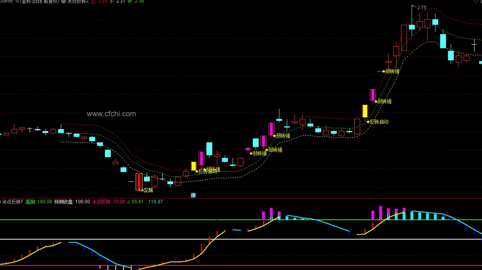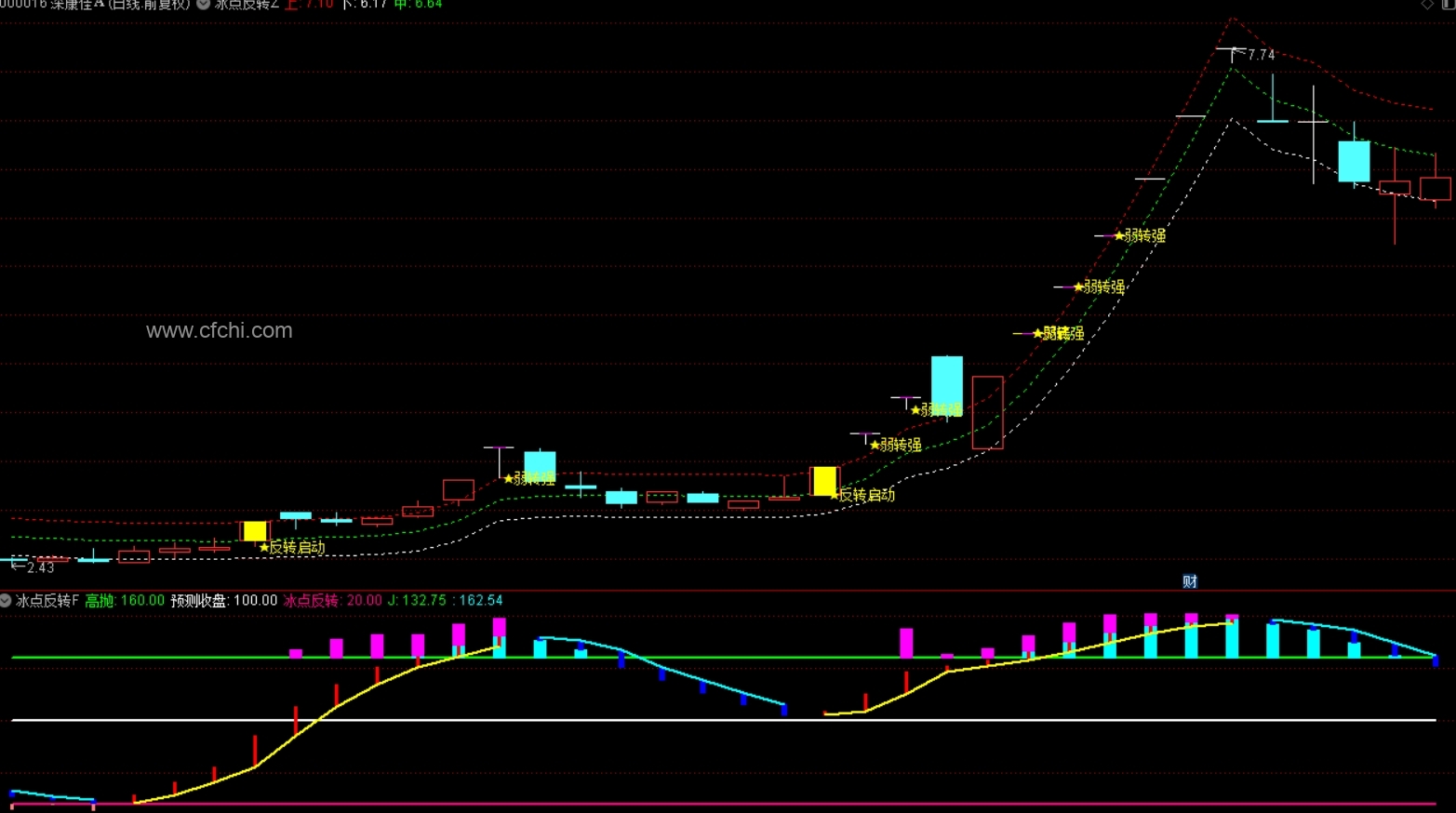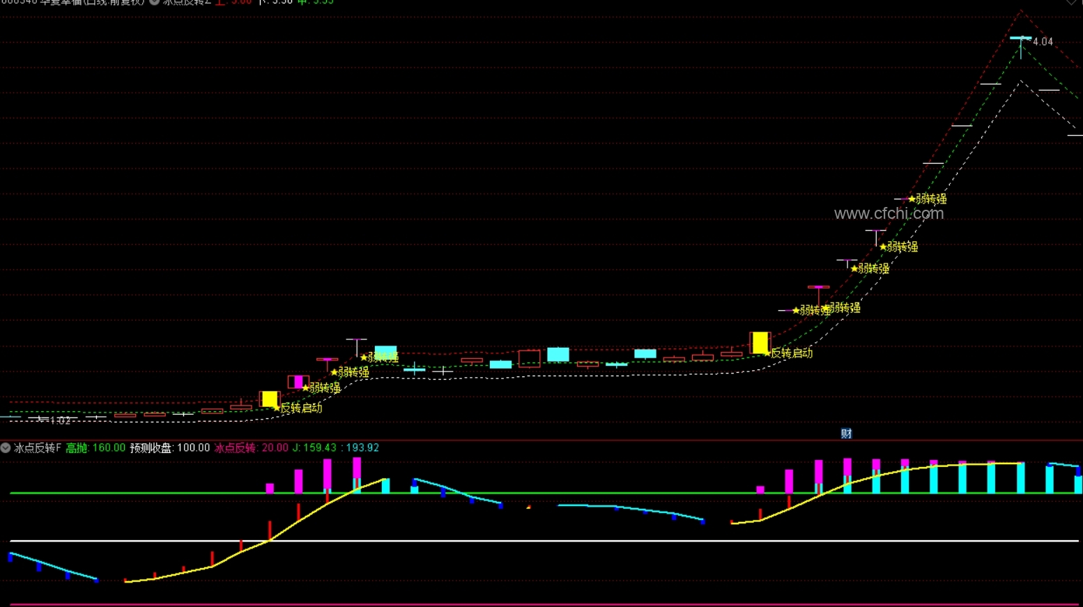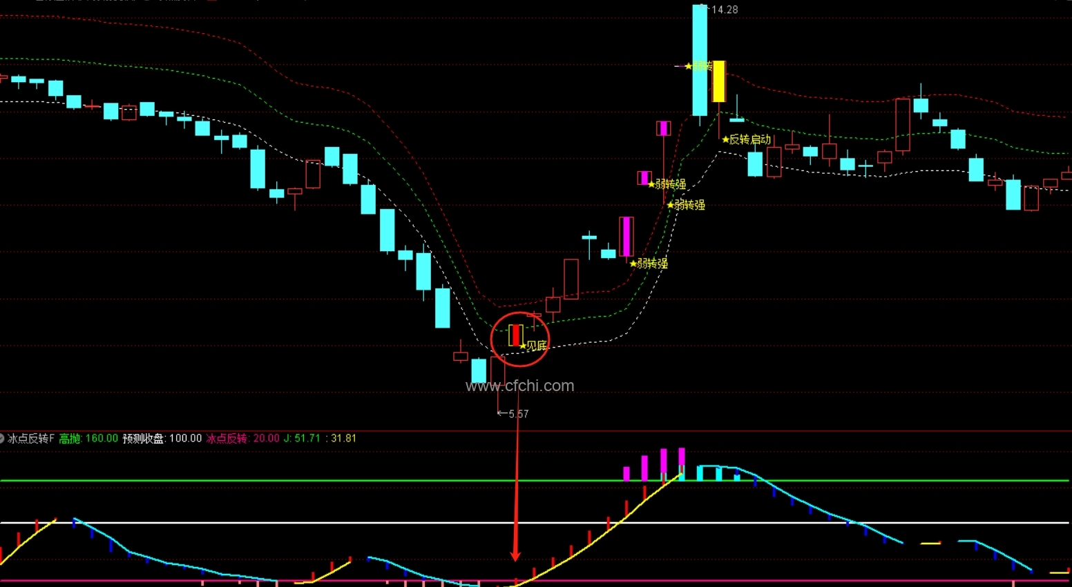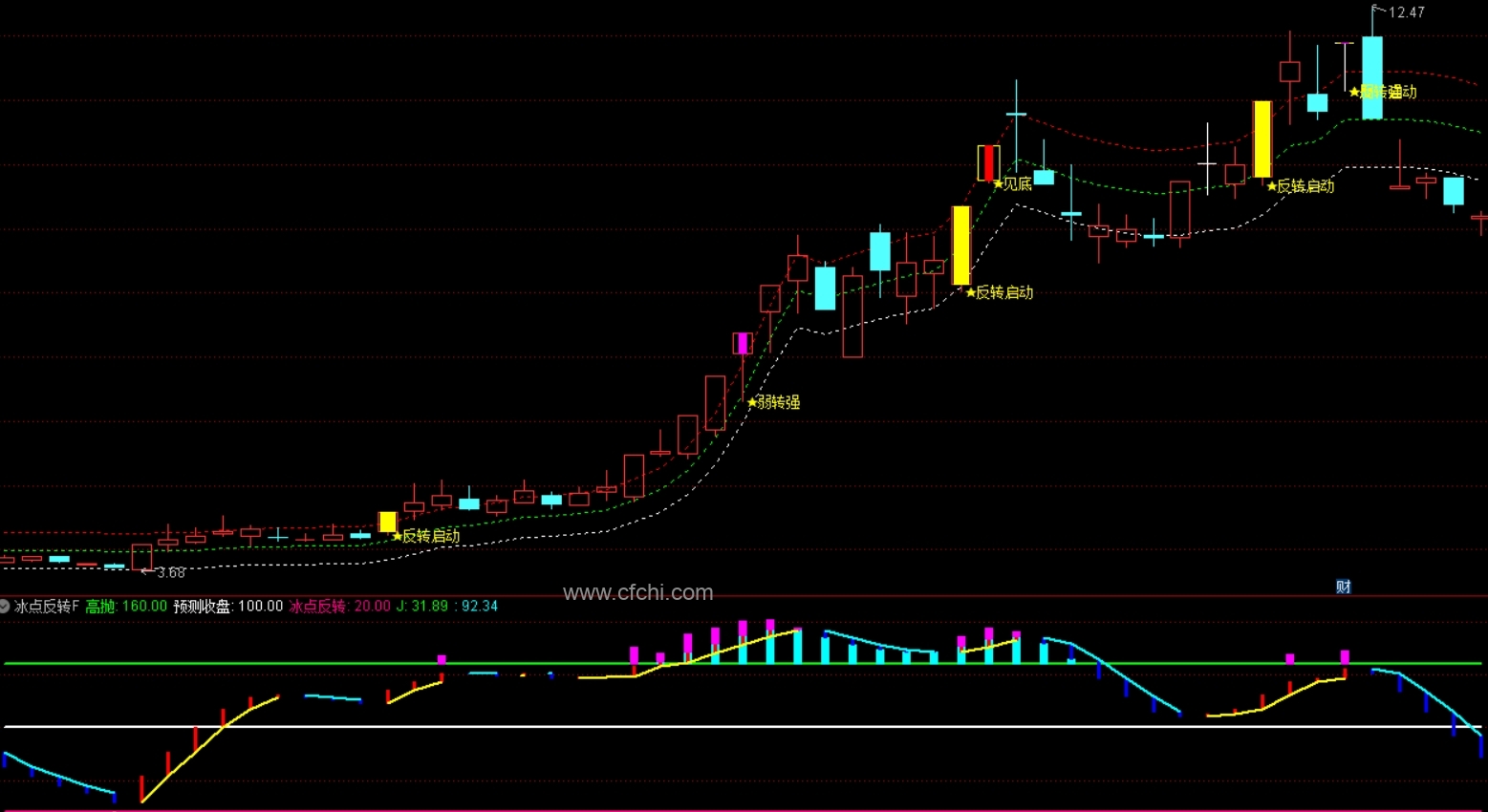 2.主图反转启动信号,副图山谷红柱见底信号共振是确定性的打板机会。