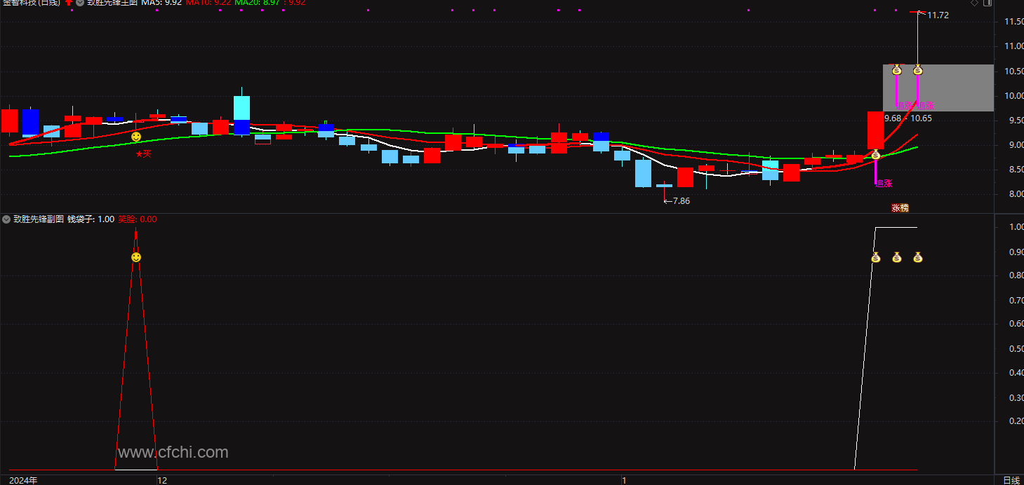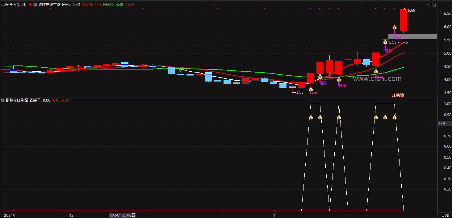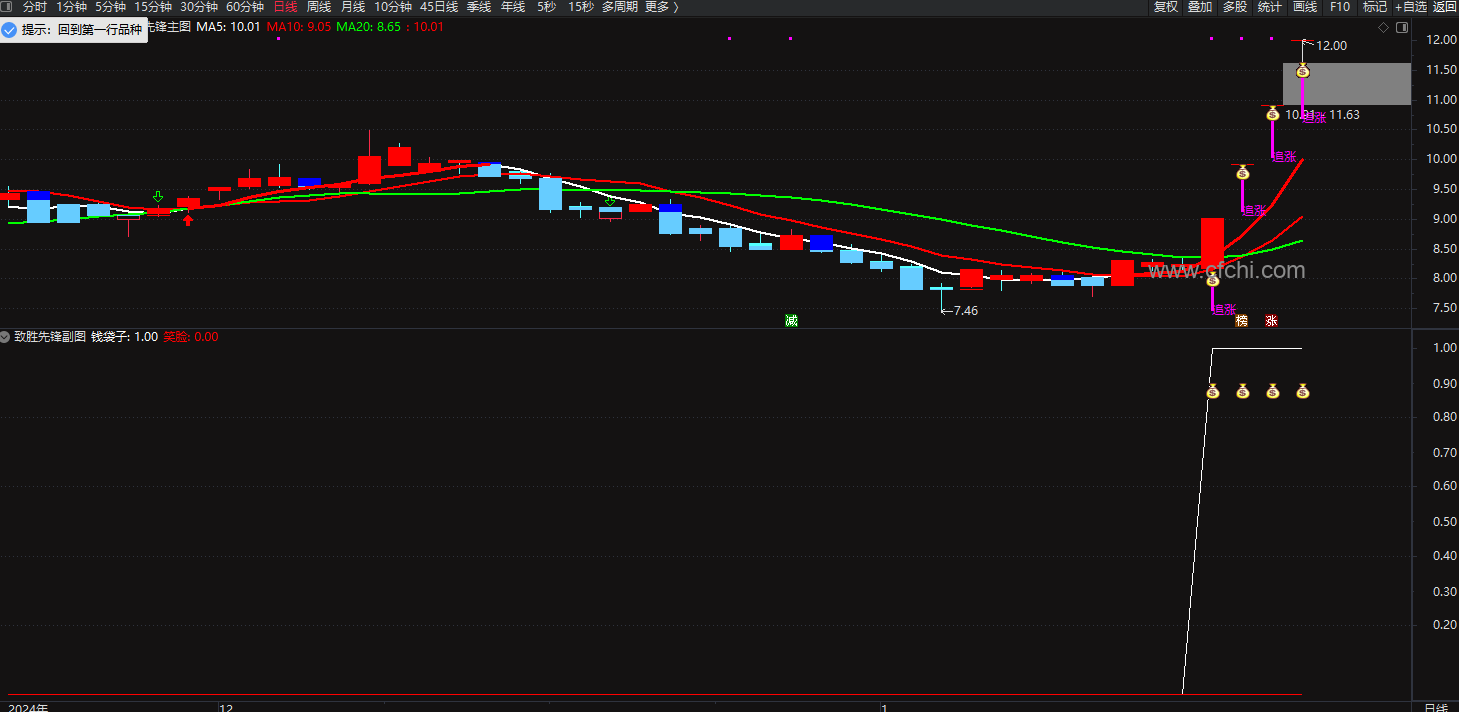 4、当市场出现急剧上涨且收盘价接近当日最高价时,指标发出“钱袋子”追涨信号。该信号提示市场动能强劲,可能还有进一步上涨的空间。信号触发时,主图上会在低价附近显示紫色的竖线和“追涨”字提示,同时伴随钱袋子图标。