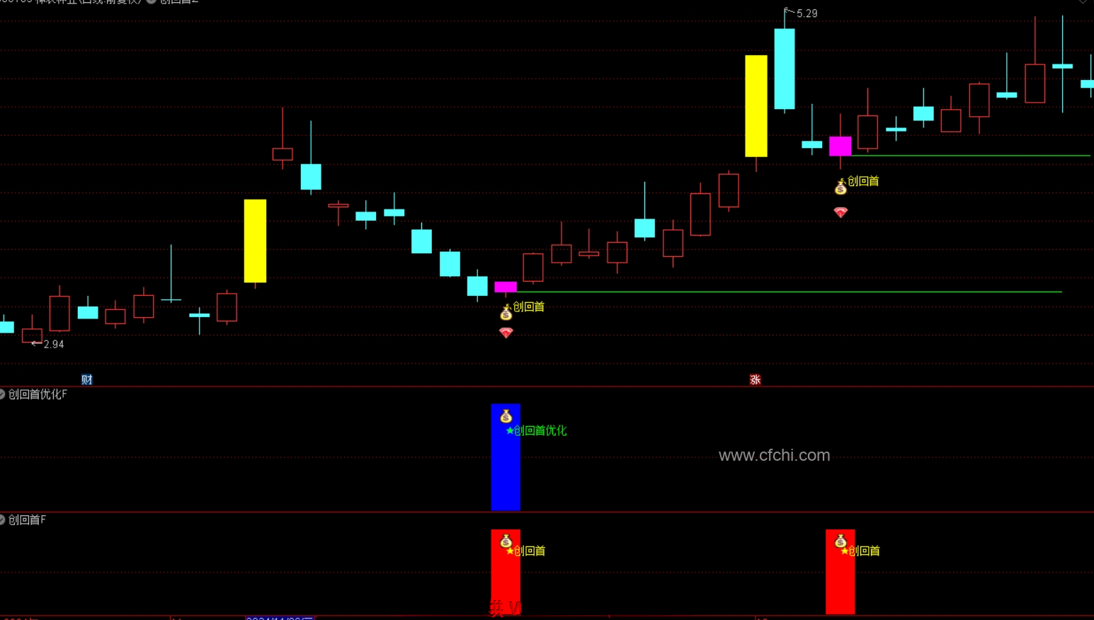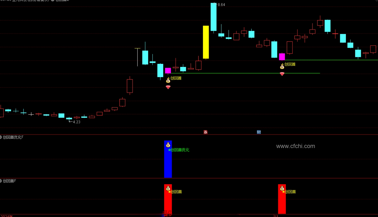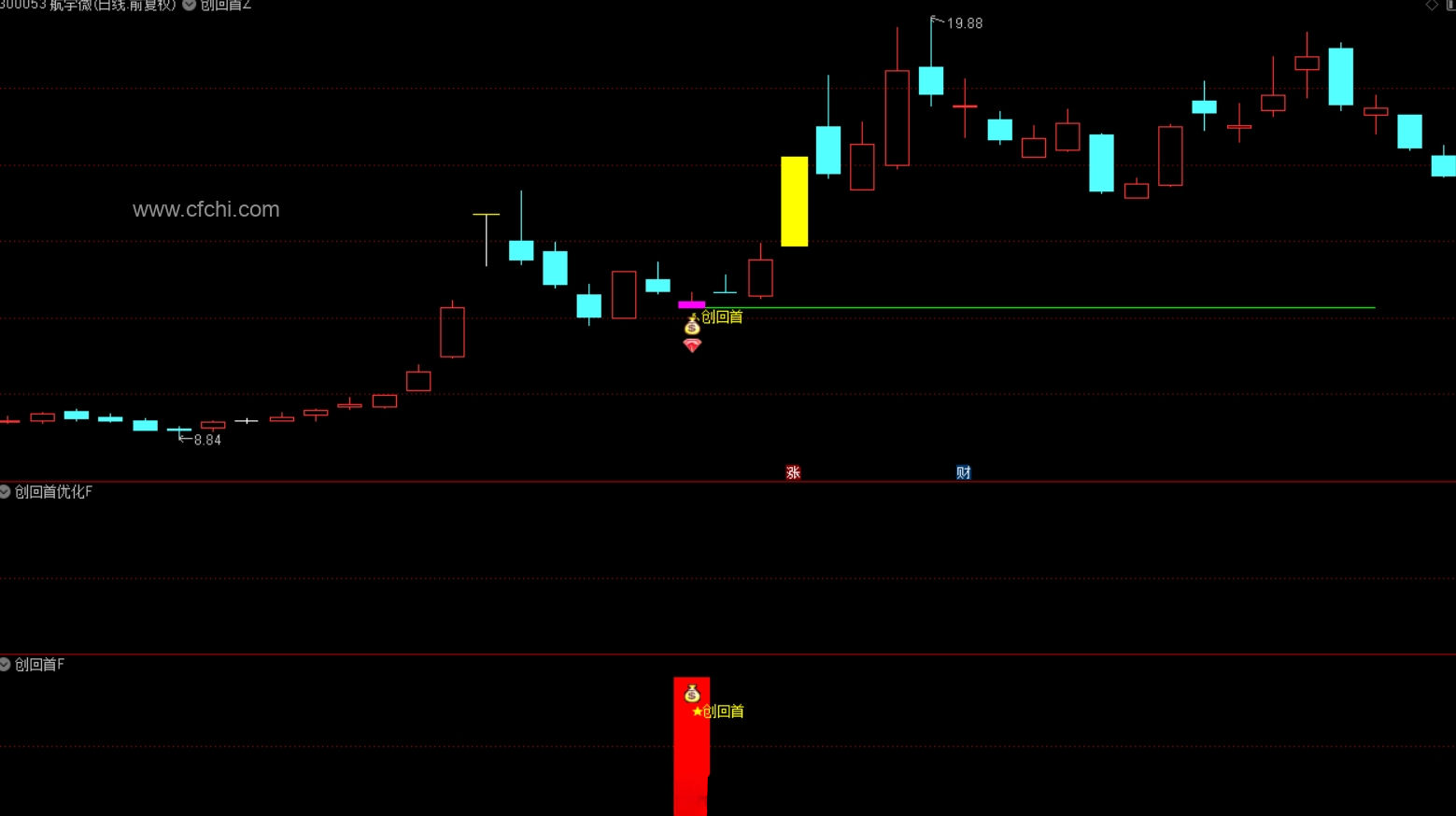 1.实时捕捉市场动态:当盘中出现符合特定条件的信号时,【创回首】指标会及时出现提示信号,通过配套的选股公式进行筛选,可以更精准地锁定潜力股。