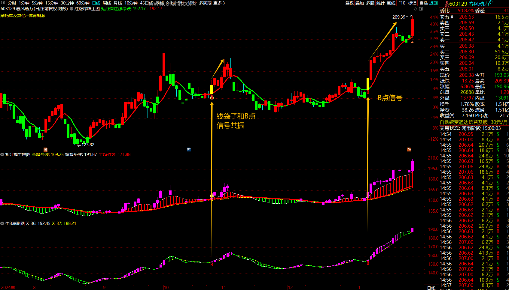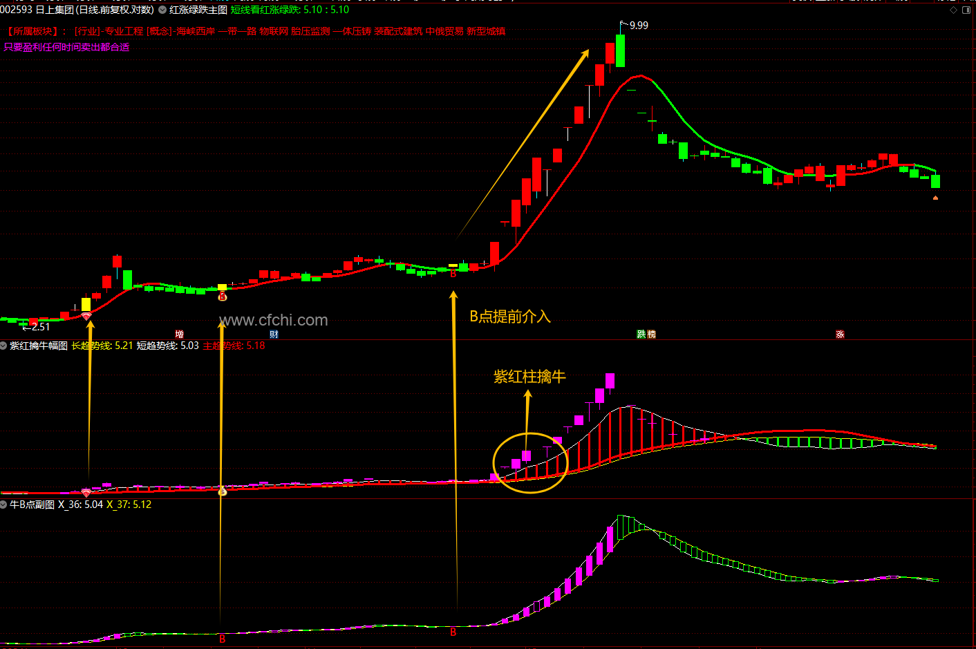 (通达信【紫红擒牛】指标1主图2幅图3选股/紫红柱牛B点抓主升浪不含未来函数)