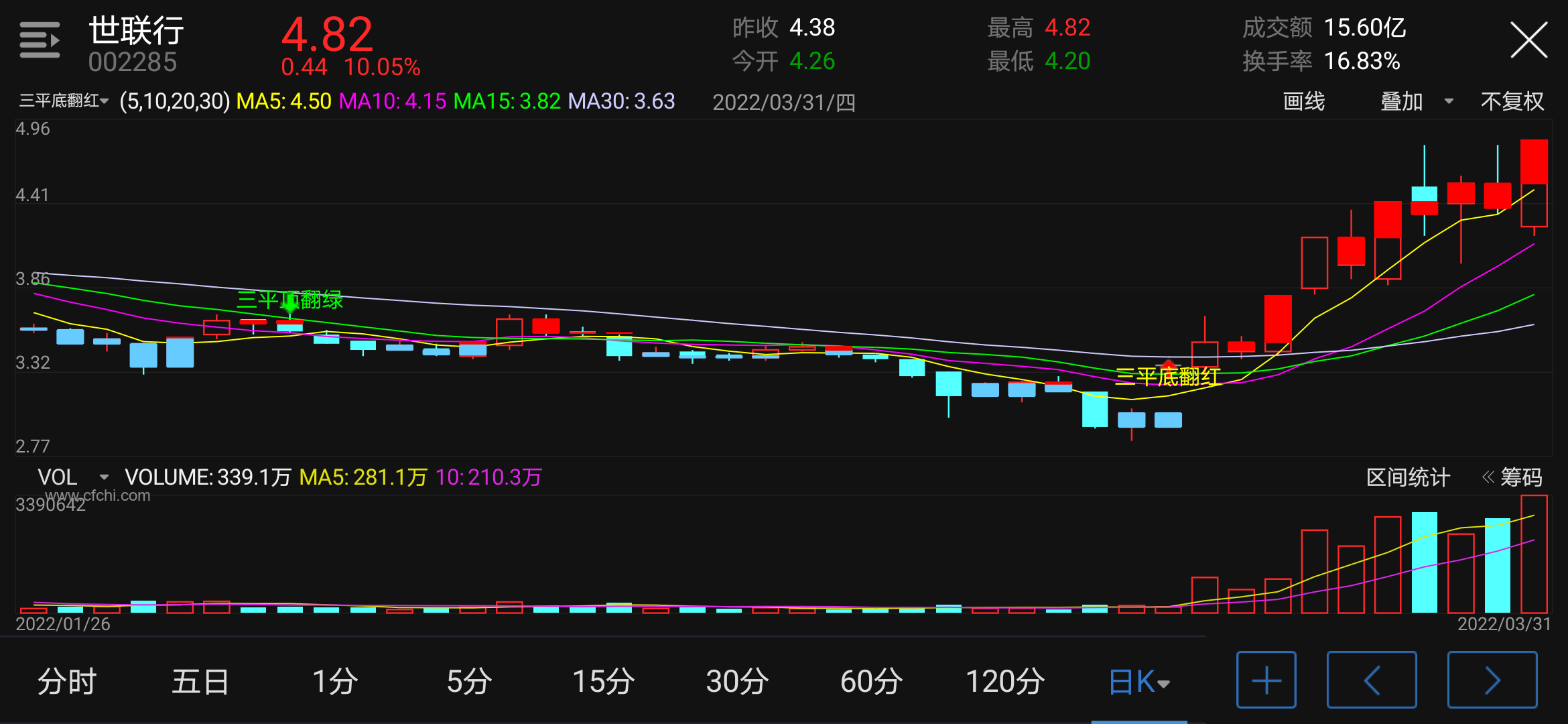 • 移动平均线:包括MA5、MA10、MA15、MA30,用于判断市场的短期和中期趋势。
