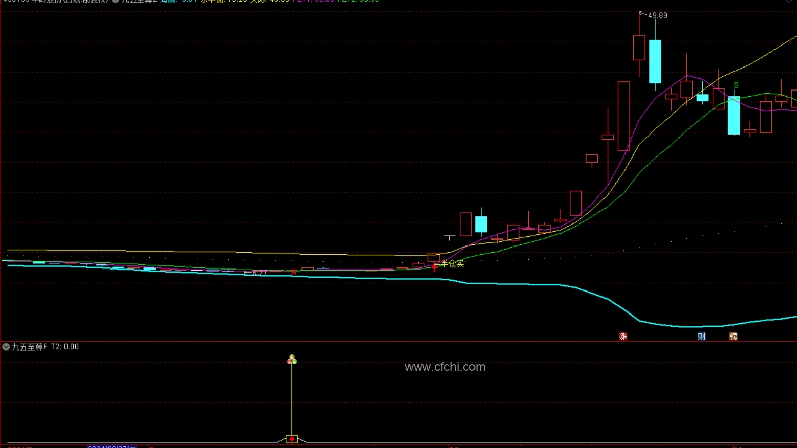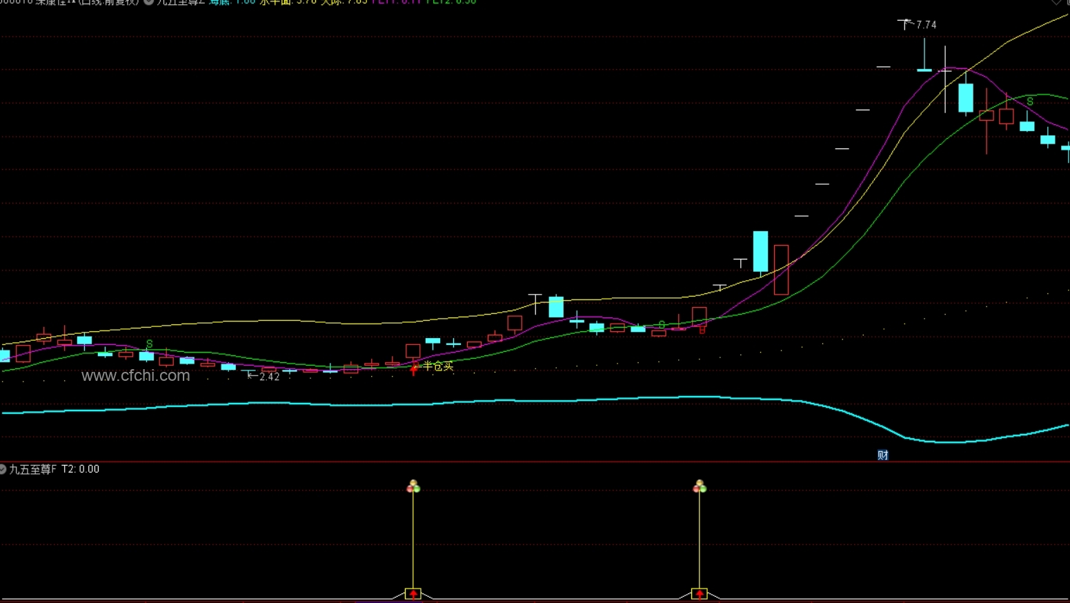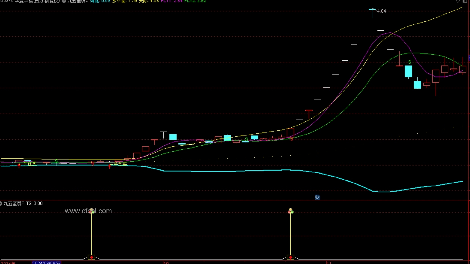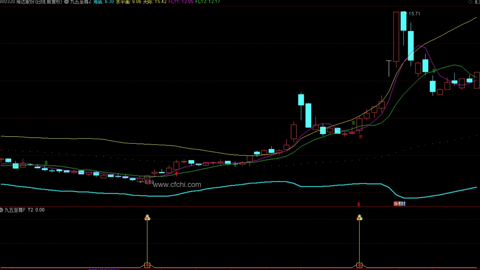 之所以叫九五至尊,是因为本指标的主图中,有五条线,加上主图上的四个信号,总共是九,所以加起来就是九、五,而该指标非常精准,所以叫九五至尊;