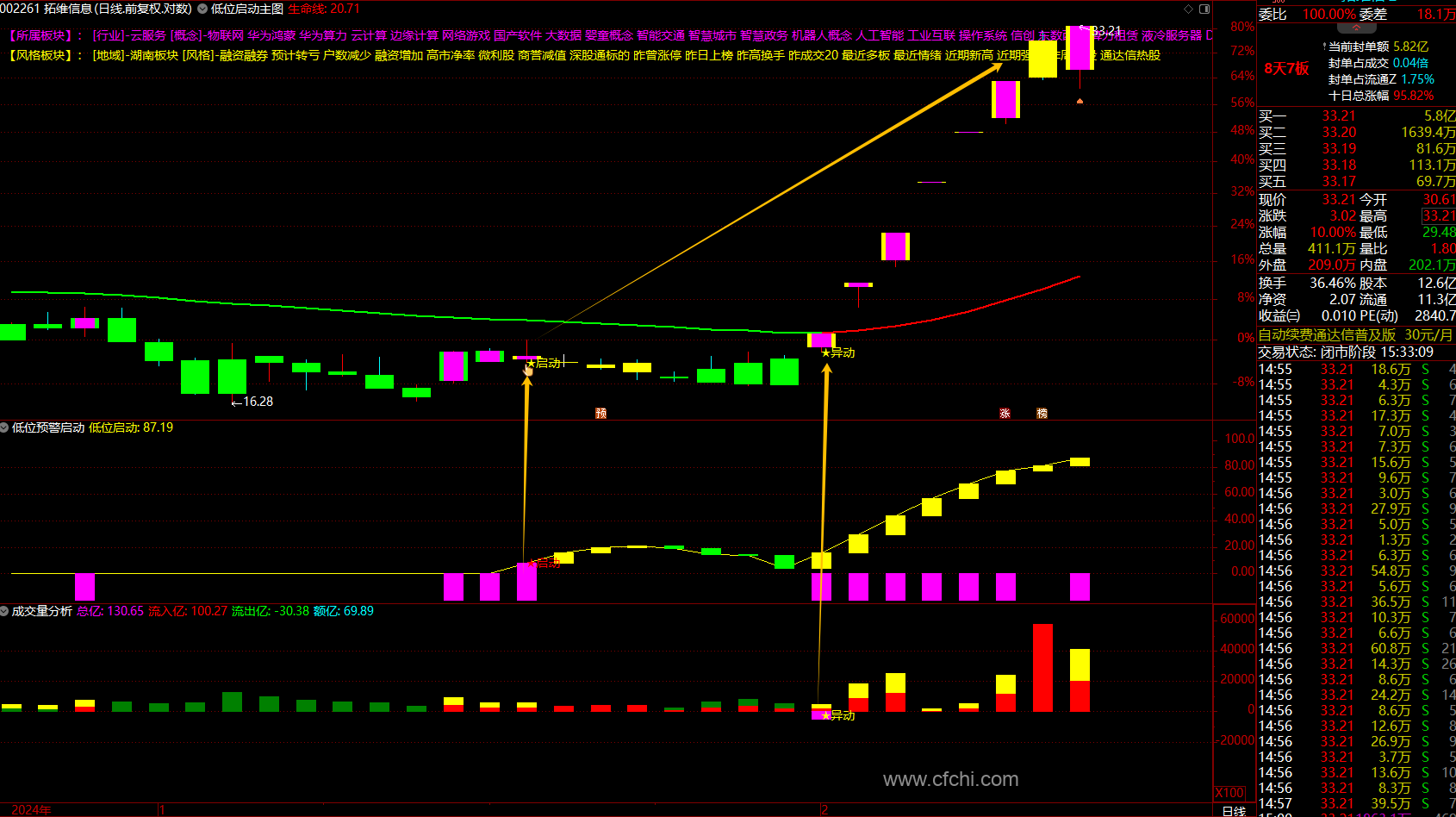 先发出低位预警信号后,出现启动信号时、可以考虑轻仓介入。紫色柱代表有资金吸筹,当黄色柱