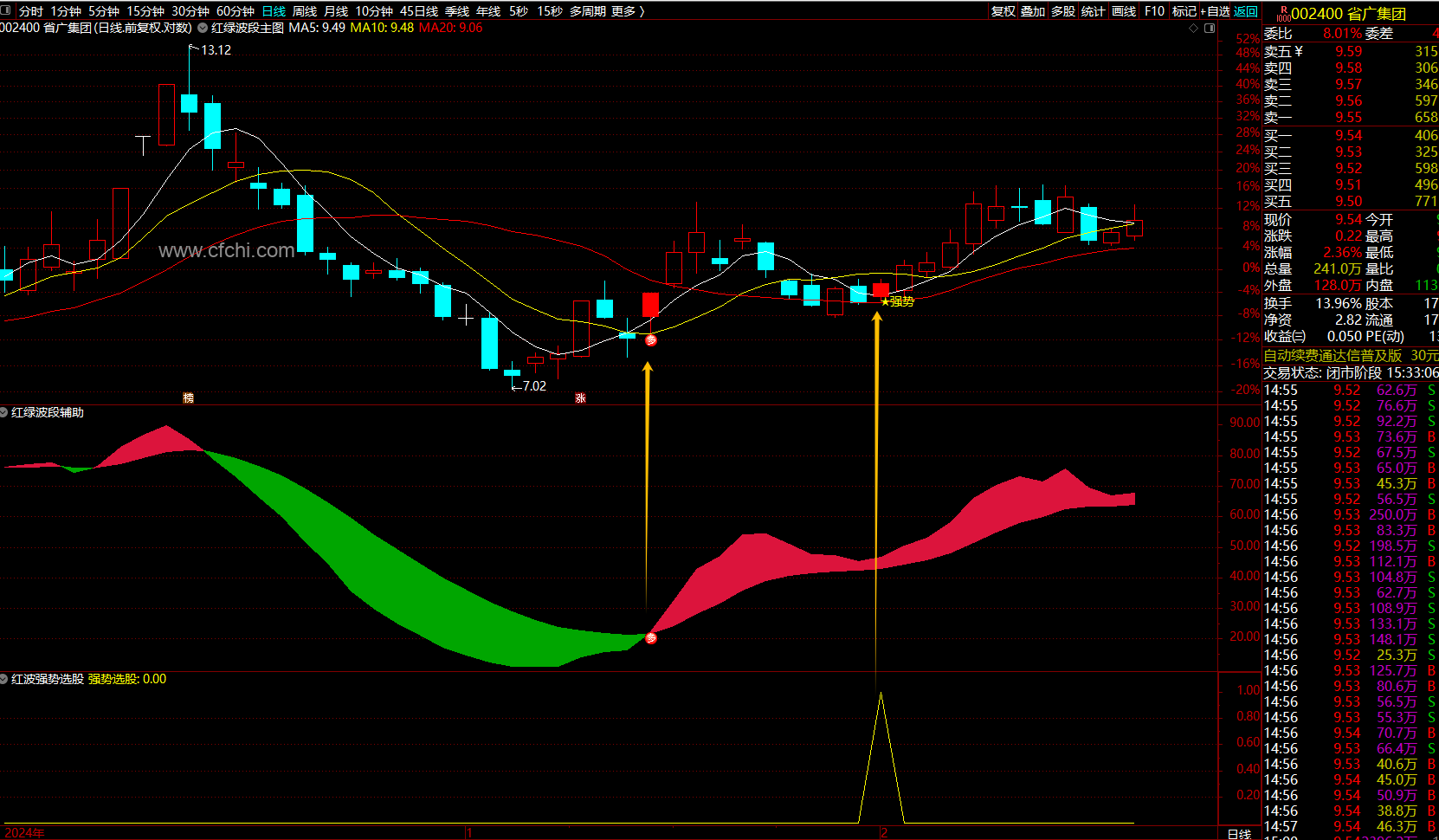 在 红绿波段辅助幅图中底部区域,绿色区域转为红色区域时,往往是抄底的良机,可积极关注
