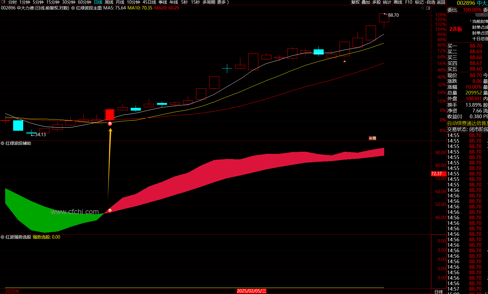 红绿波段辅助趋势确认信号:红绿彩带作为市场趋势的直观反映,为提供明确的买卖信号。