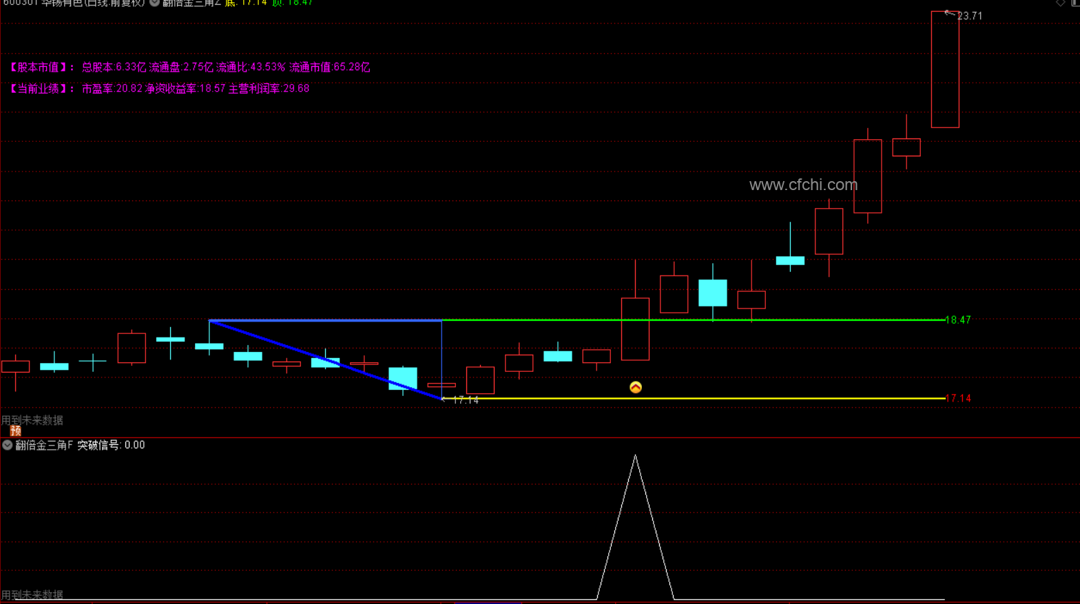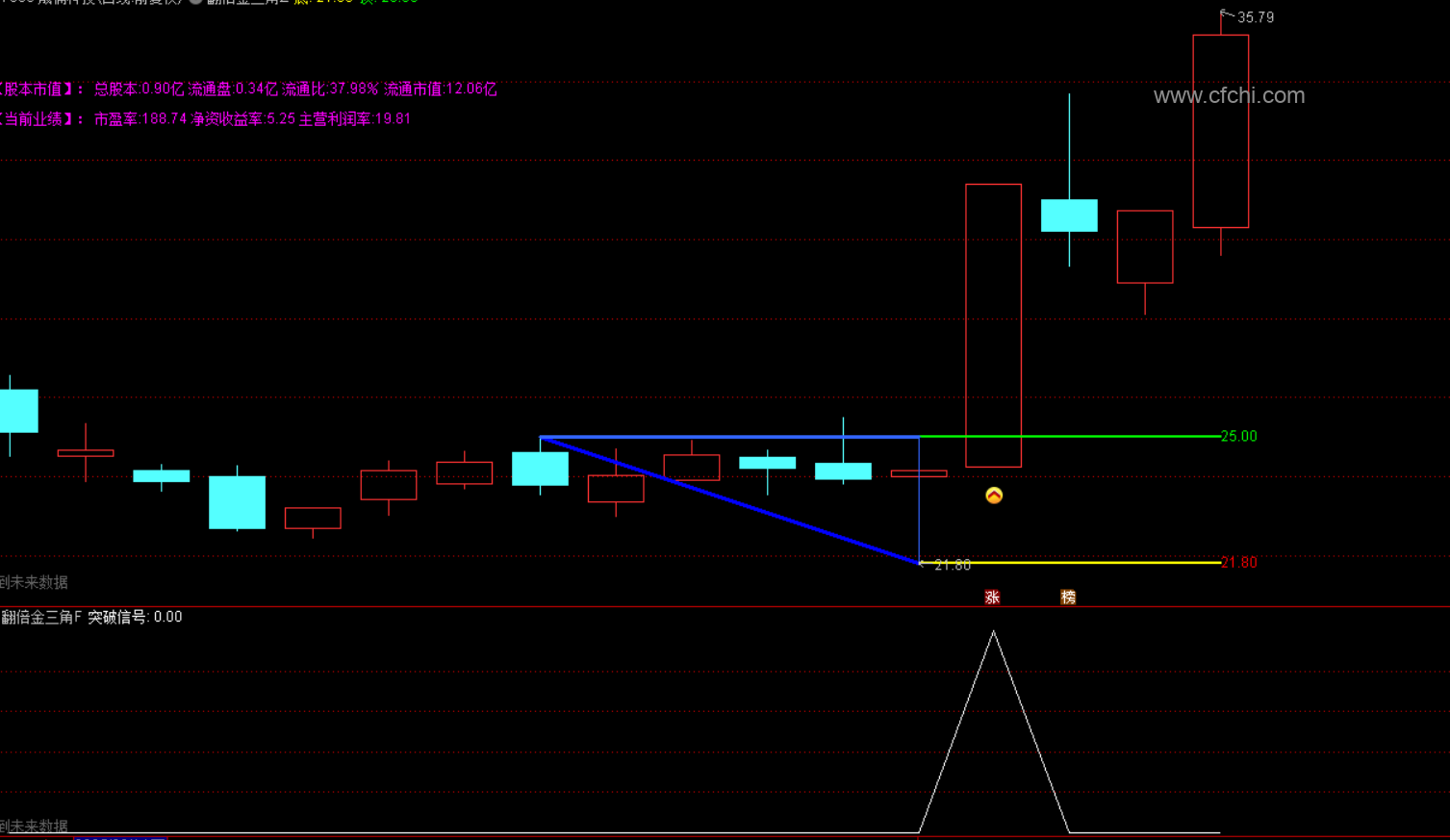 三角形态突破指标,绿色为突破买点,绿色与黄线之间的区域为支撑,同时也是止损点位,标注了相对应的价格,直观的显示价格区间,和第一目标区间。