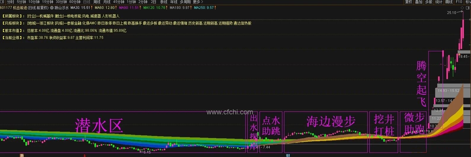 1.潜水区位置:图表下方的蓝绿色区域。意义:当市场处于潜水区时,说明股价处于较低位置,市场参与度不高,风险较低但收益也可能较低。此时,投资者可以保持关注,但不宜轻易买入。策略:在这一阶段,建议投资者耐心等待,密切关注市场动向,寻找潜在的买入信号。