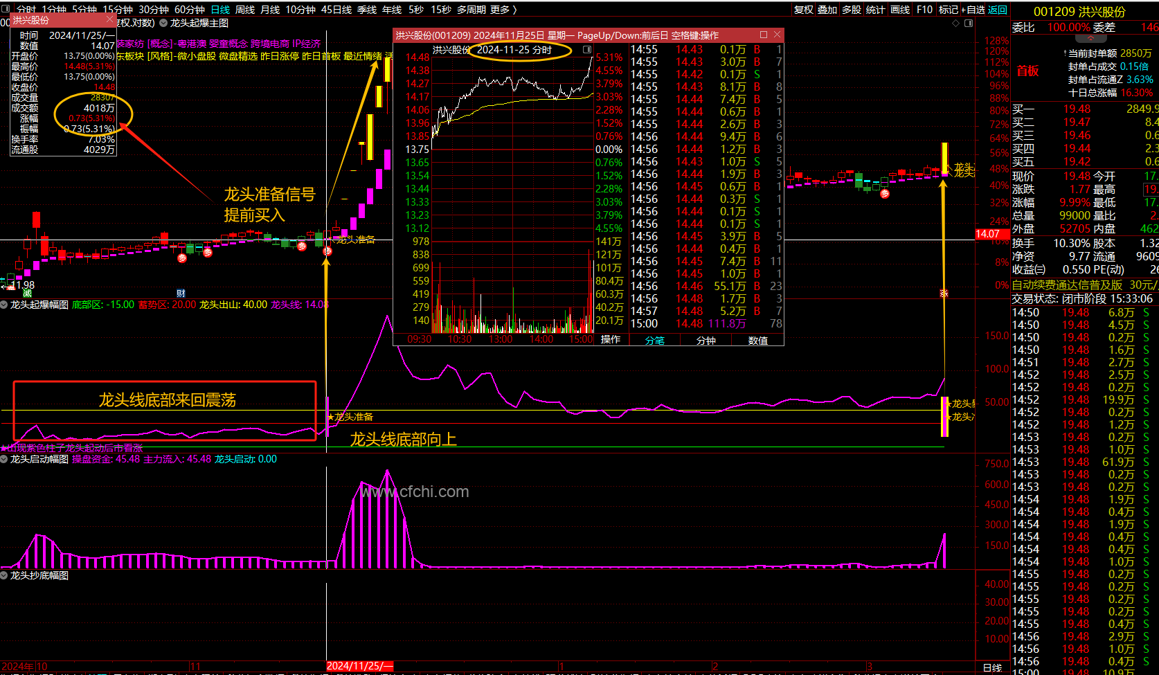 黄色柱子,同时显示龙头起爆字样,这就是主力资金进场,可以挂单买入,当龙头线冲到