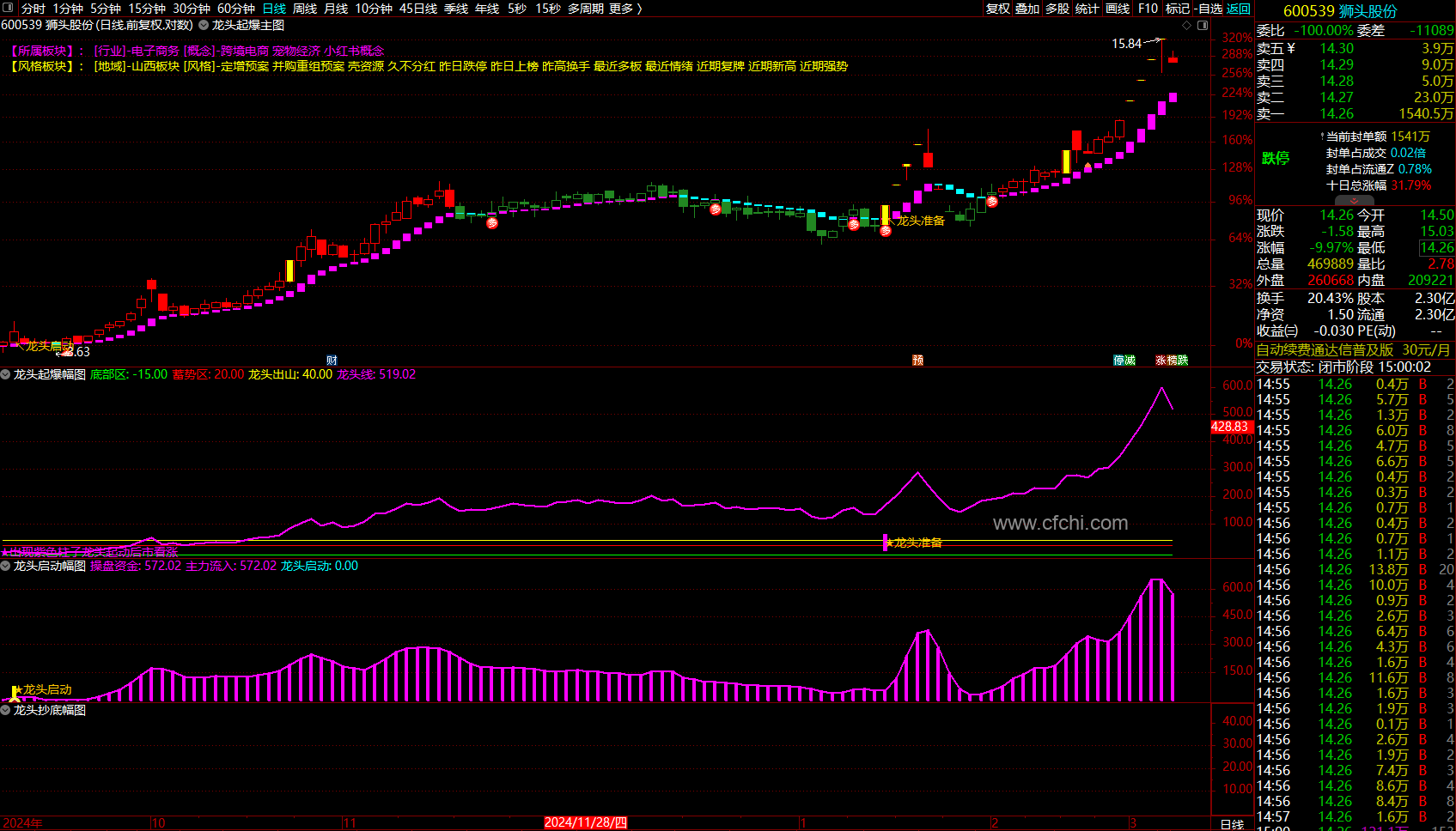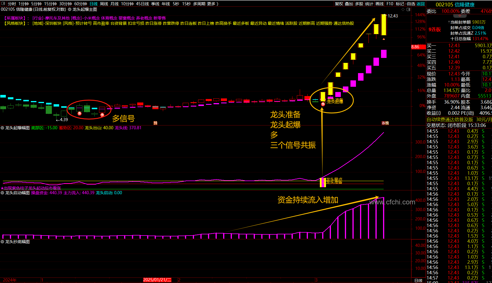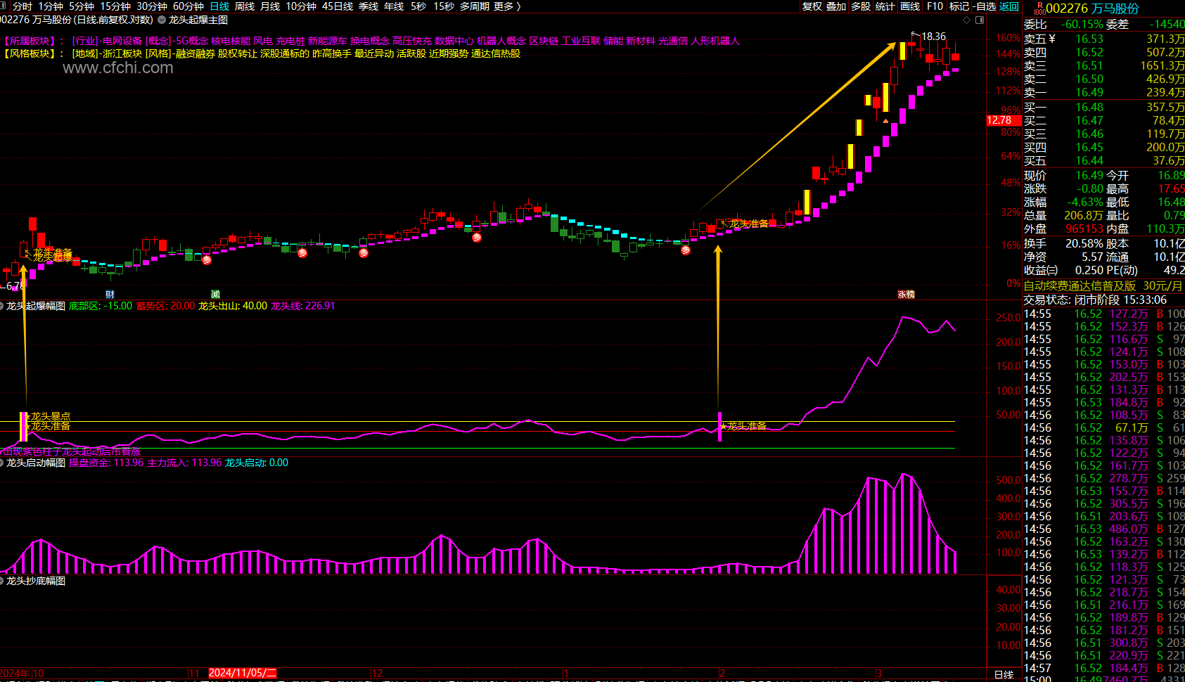 这种票当天90%封板。配合5日均线使用效果好,股价踩着5日线出黄柱或紫柱,上涨概率极大。