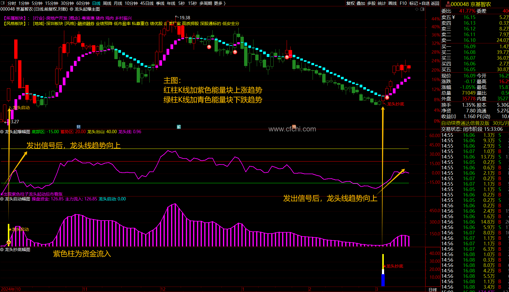 1、龙头起爆主图:主图加入板块信息及情绪异动,主图K线红柱加紫色能量块比较强势,