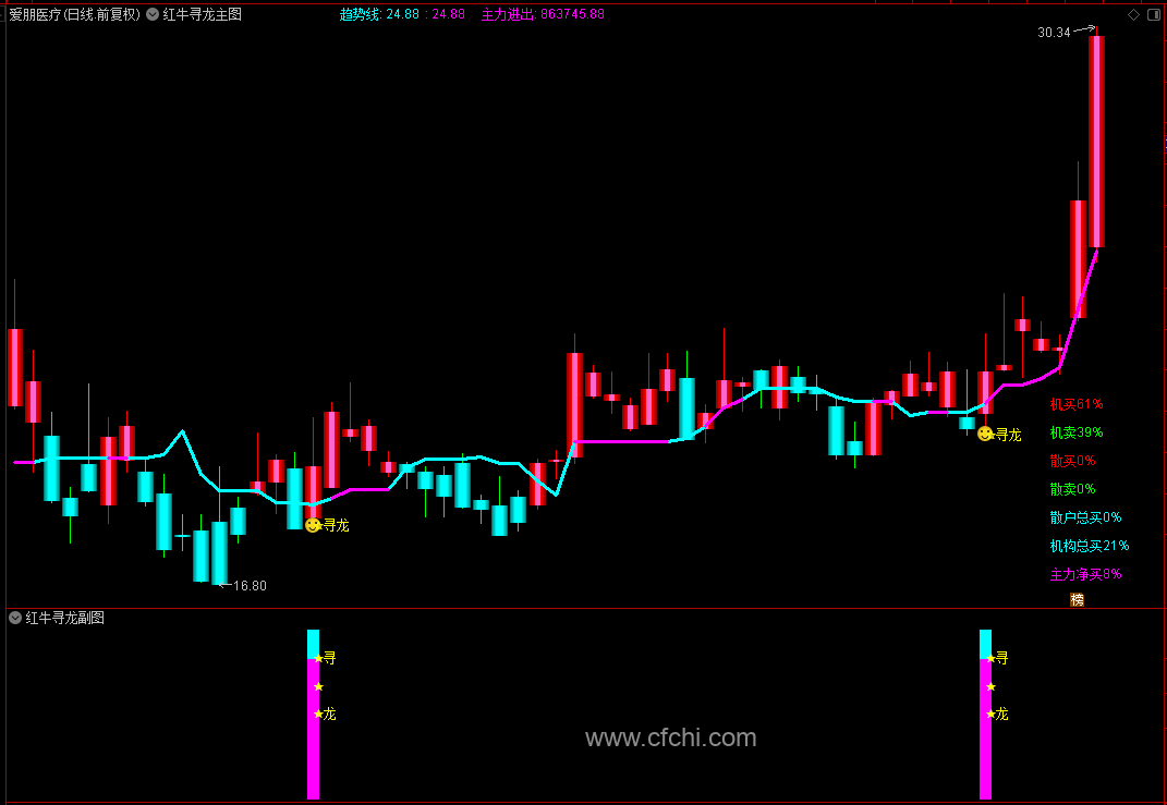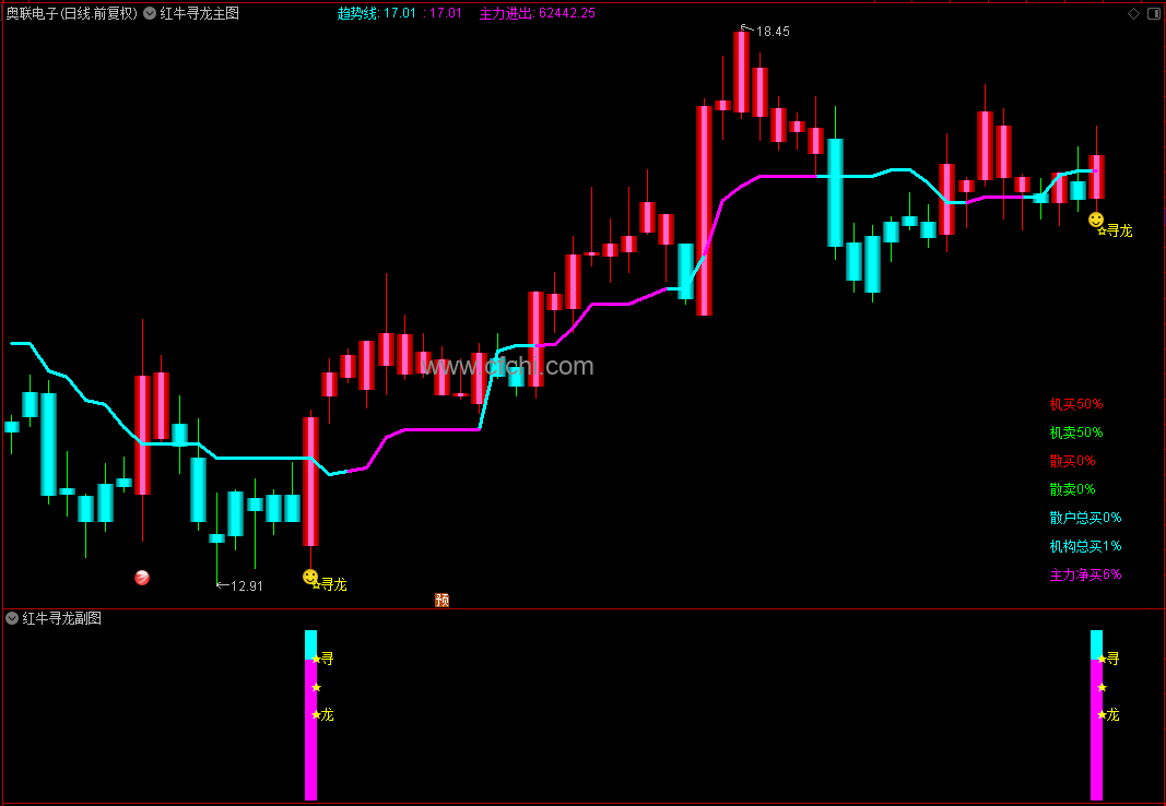 3、红牛区K线为红色时持股,蓝线转绿时立即卖出;首次突破趋势线+红K时,显示"笑脸"图标"寻龙"信号,此时趋势线需呈上升趋势且股价站稳(呈紫色线),增强买入确定性。