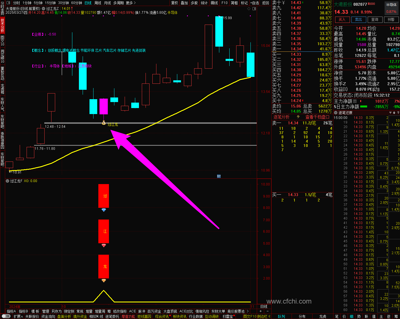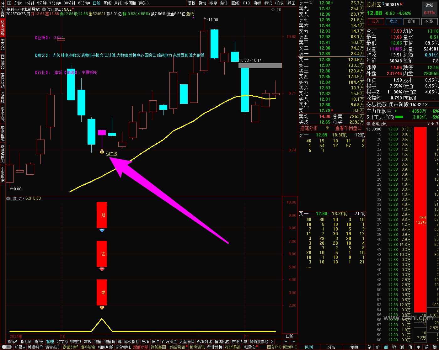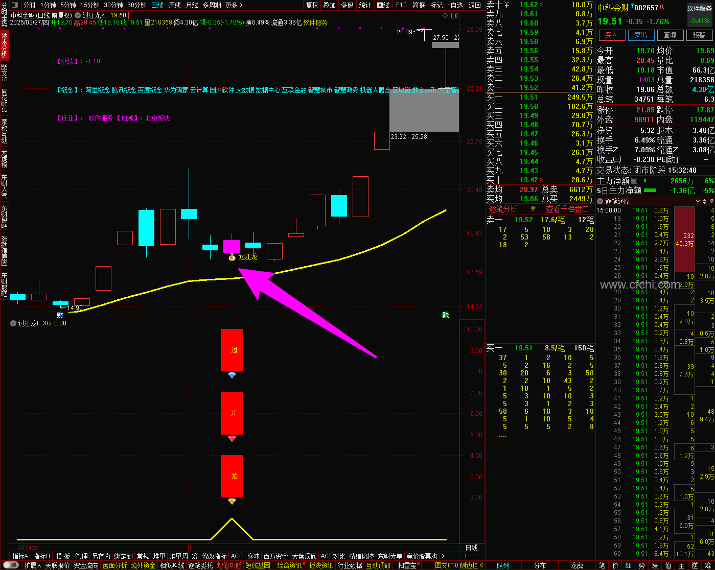 过江龙,是一款龙回头选股指标。强势股在拉上过程中经常会遇到一些坎坷,于是就出现中途调整。或深或浅,可以理解为一条江。一旦跨过这条江河,就成了过江龙,开启下一轮主升浪行情。