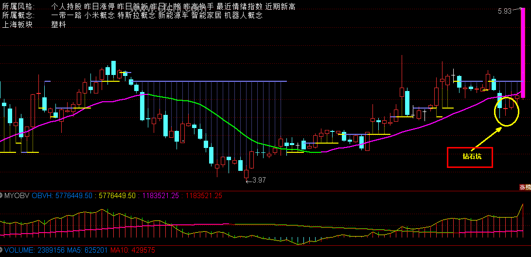 自编顶格筹码峰主图指标,实用性较强,不带未来函数,希望能帮助到大家。说明:主图上有一根21日均线,二种顶格筹码峰水平线:灰色是压在股价上方的压力线,黄色是被踩在脚下的启动线。这个图的好处是,可以在主图上一目了然地看到顶格筹码峰的变化,可与其他辅助指标配合作出投资决策。特别留意灰线与黄线转化时的机会。上涨过程中,筹码会不断上移,如果顶格峰(水平黄线)不动,一般可以继续持有;当顶部出现顶格峰(灰色线)比较频繁,注意查看整个筹码变动,当底部筹码减少时要及时减仓或空仓。有时主力主升前会挖一个坑,这时顶格筹码峰呈现灰色,这时要结合OBV指标,比较容易识别,也许是个钻石坑,不要轻易下车。