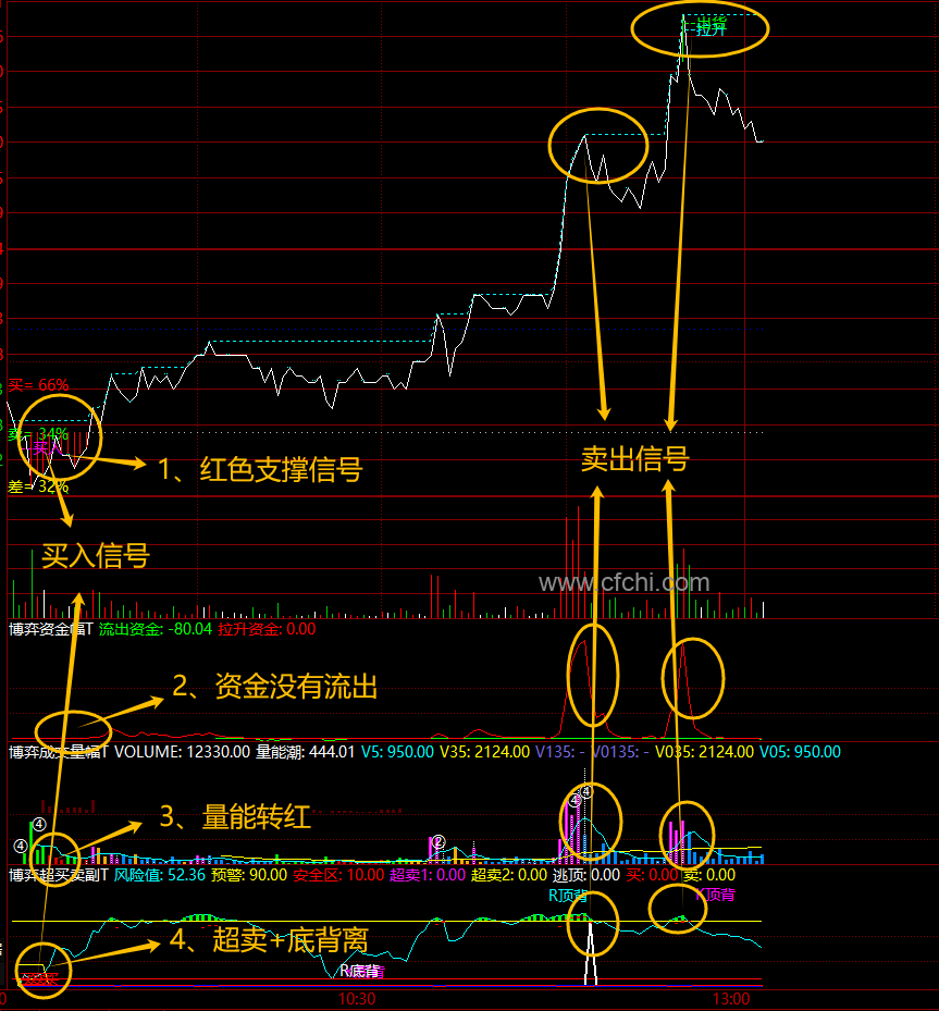 5、即支撑买入+超卖区+量能红+资金以上4个指标同时发出转多信号形成共振时,进行正向T+0买入,买入后反弹