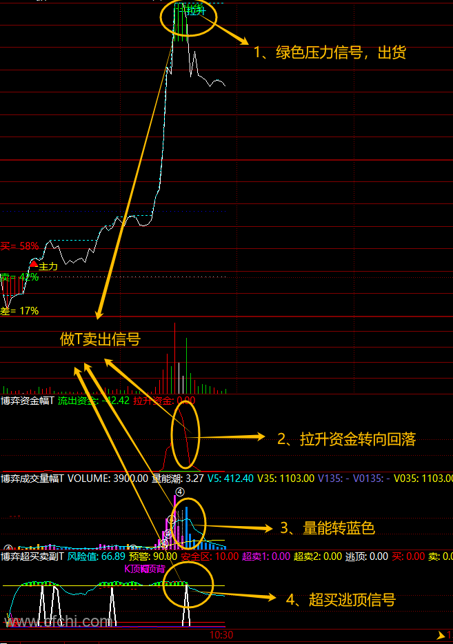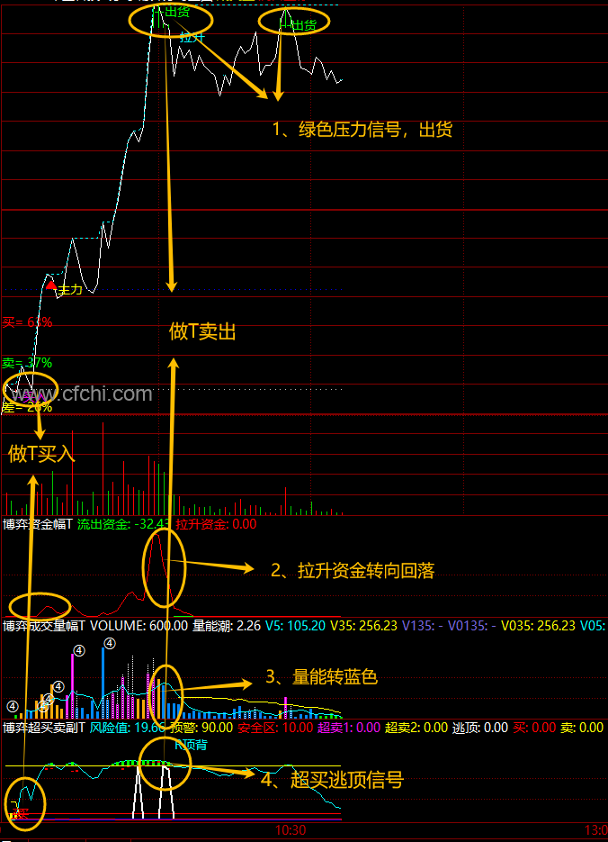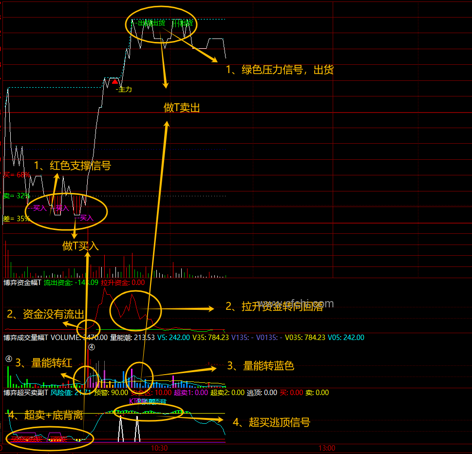 5、即压力出货+超买区+量能+资金这四个指标同时发出转空信号形成共振时,进行反向T+0卖出,卖出后下跌减弱时