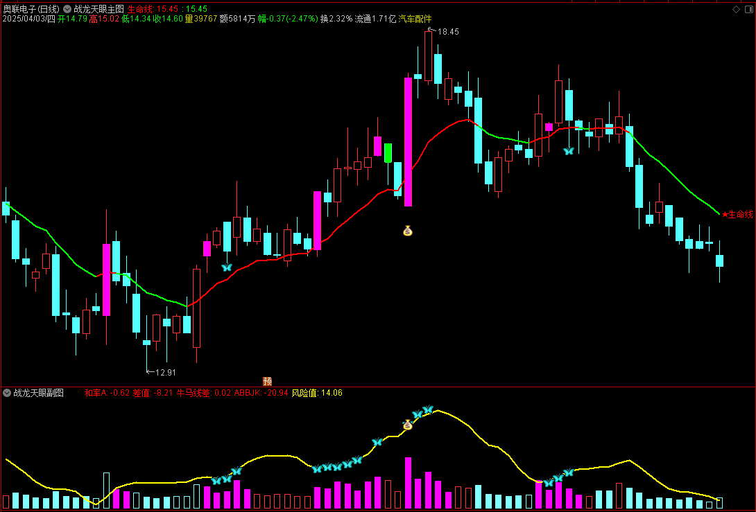 1. 主图红线代表主力资金强度趋势线,绿线代表散户资金分布状态。当红线持续位于绿线上方且形成多头排列时,配合副图紫色能量柱的持续性,可确认趋势性持股信号。特殊K线形态"绿蝴蝶"在主力资金显著强于散户时显现,预示中期趋势转折点。