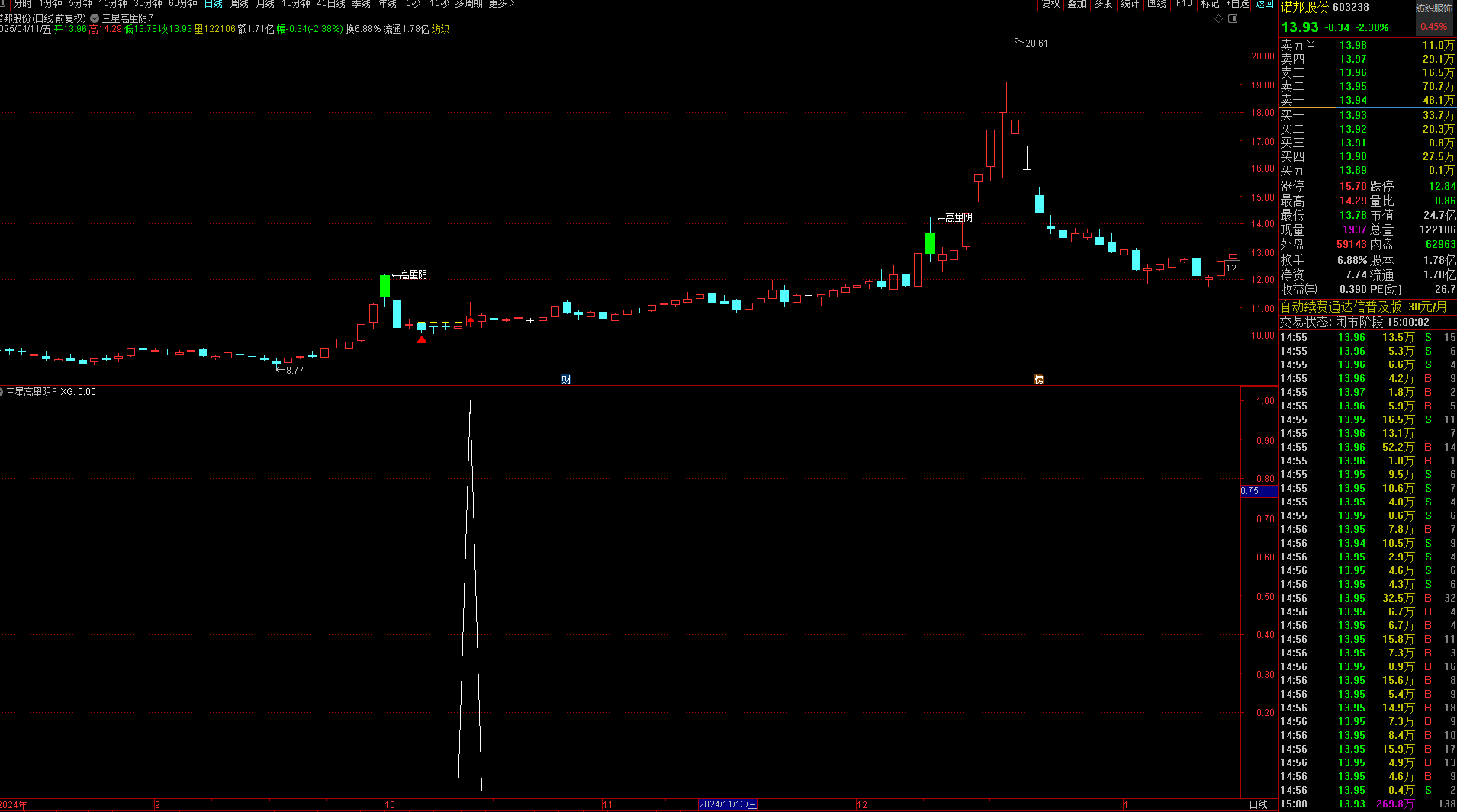 【核心逻辑】 "三星高量阴"战法聚焦主力深度介入痕迹,通过量能突变捕捉洗盘转折点。