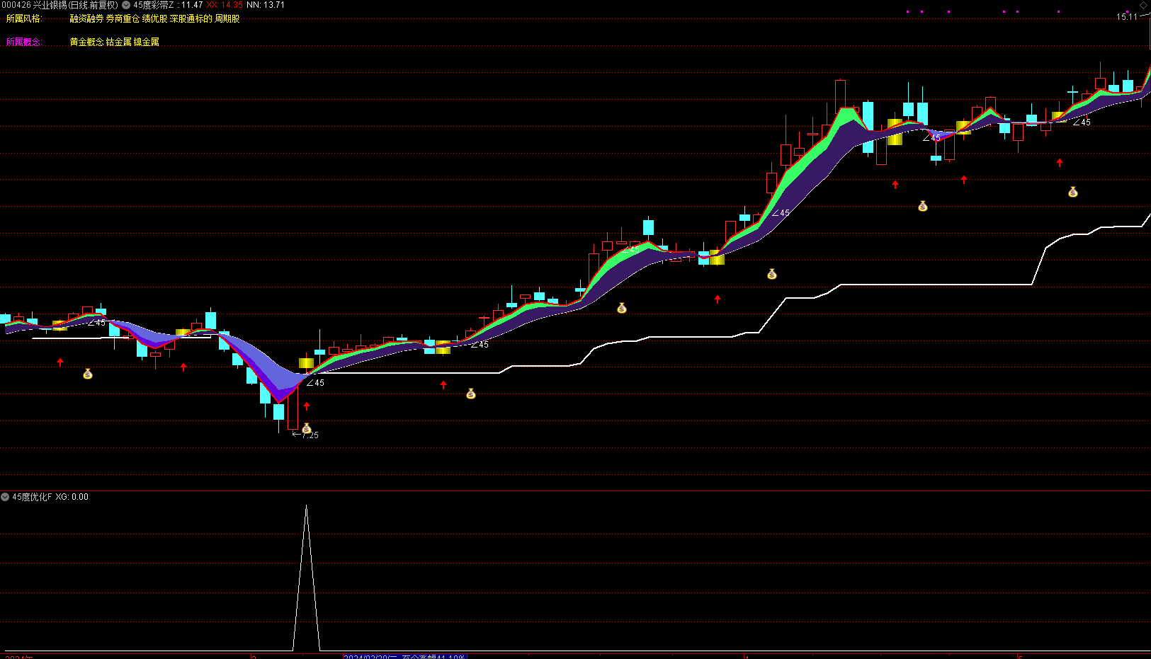 (通达信 【45度上涨彩带】 1主2副2选股 45度角上扬抓强势股 )