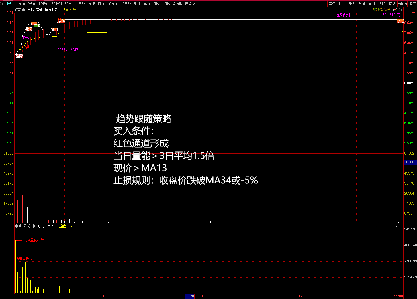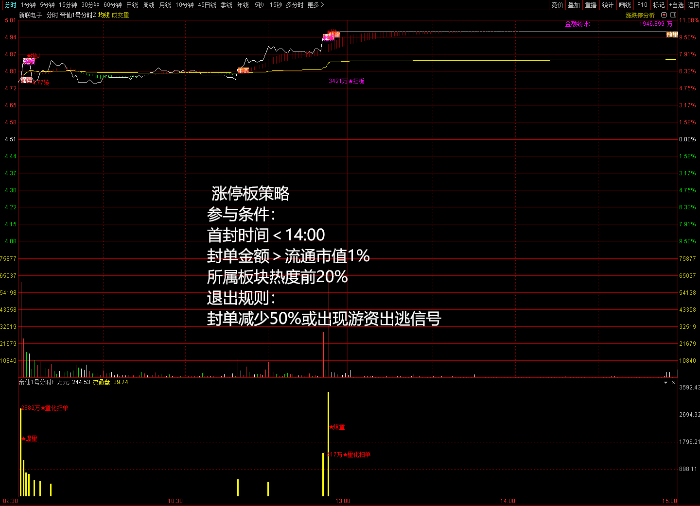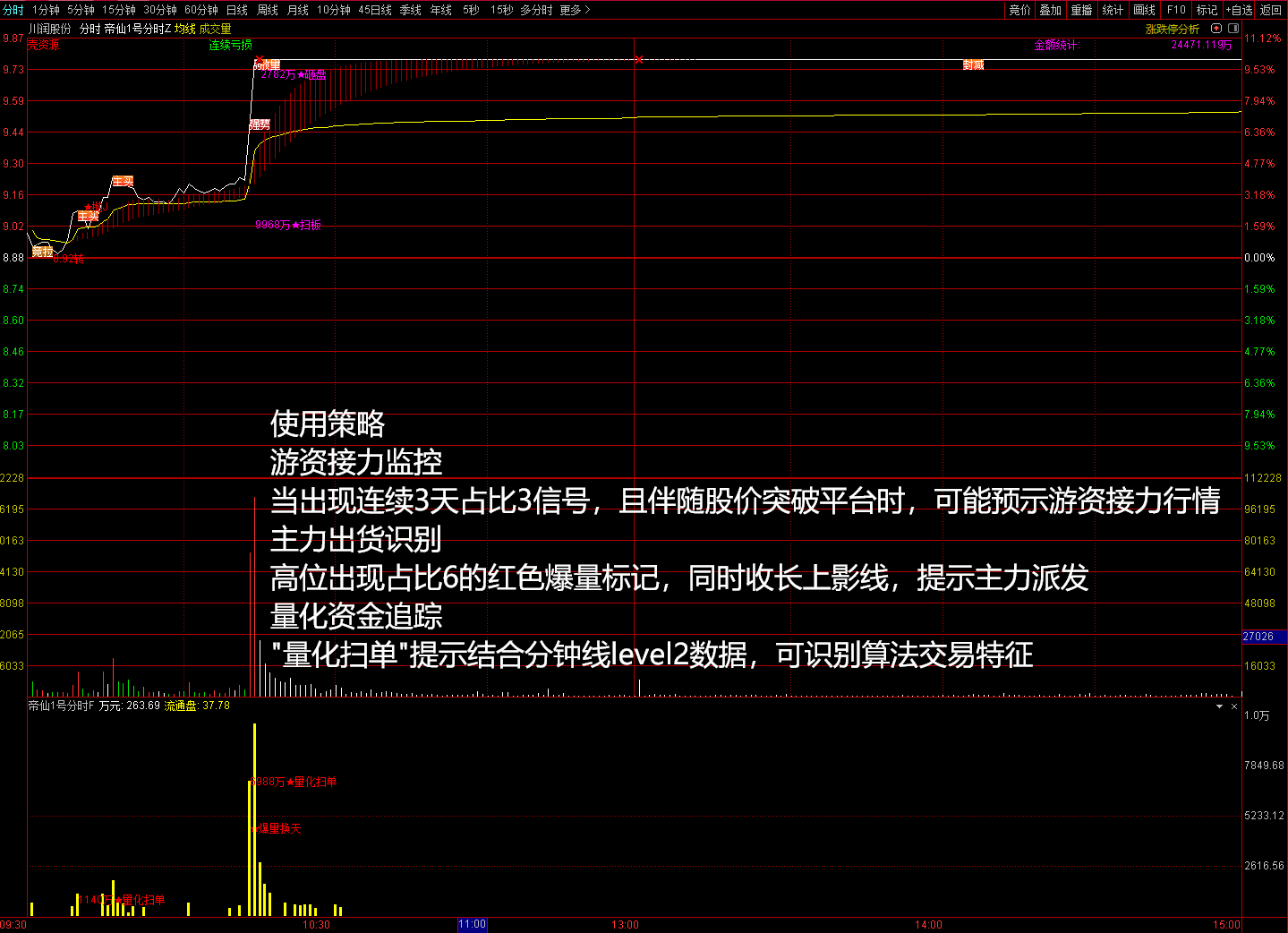 (通达信【帝仙1号】分时指标 精准买卖点主图+风险预警副图)