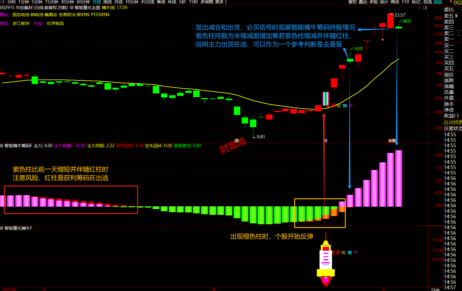 -2-量化擒牛信号原理是股价弱转强且趋势向上,并观察智能擒牛筹码幅图绿柱加橙柱底部反弹时发出信号。