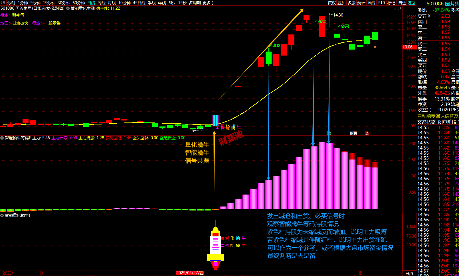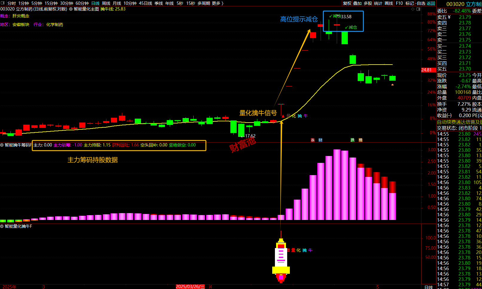 量化擒牛、智能擒牛、减仓、出货、必卖信号,发出信号后结合两个幅图及市场资金进出情况综合判断。