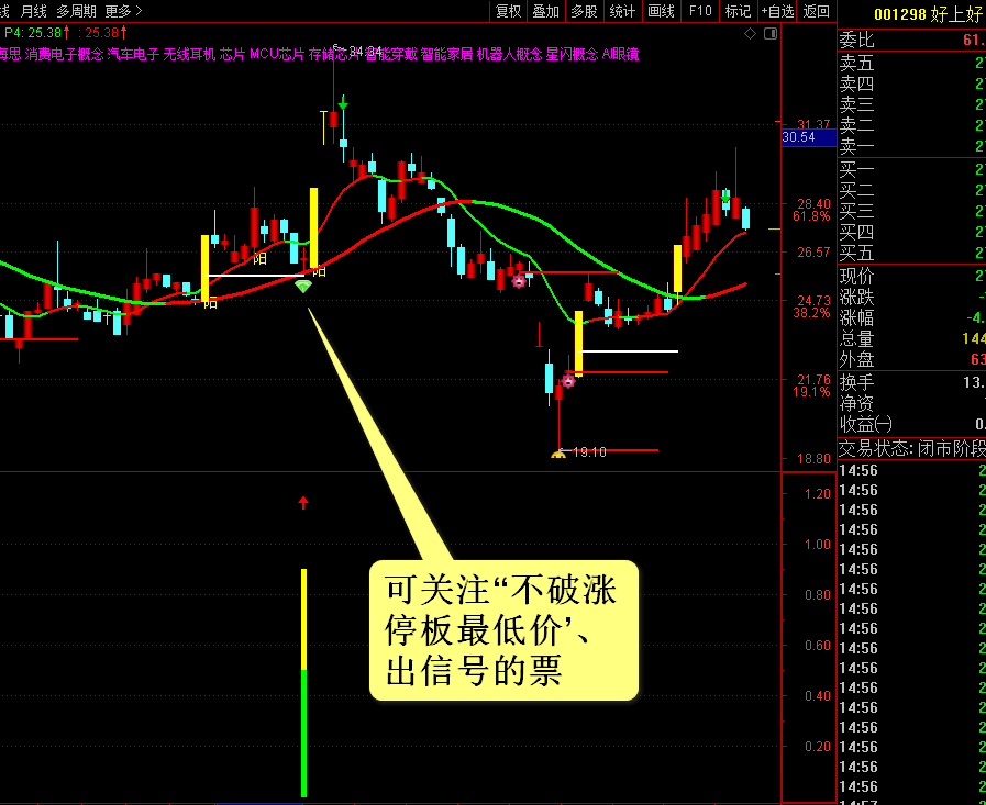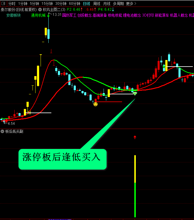 (涨停板后逢低买入:板后低买,主图、副图、选股。)