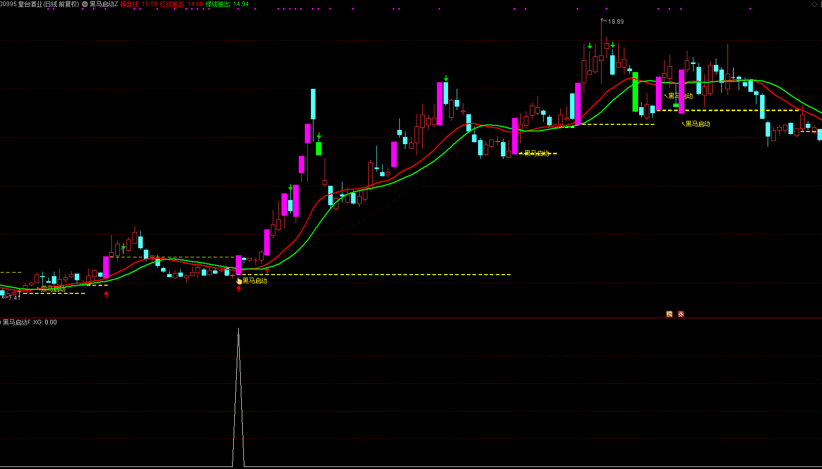 出现"↖黑马启动"文字+箭头图标 =买入(20%仓位)