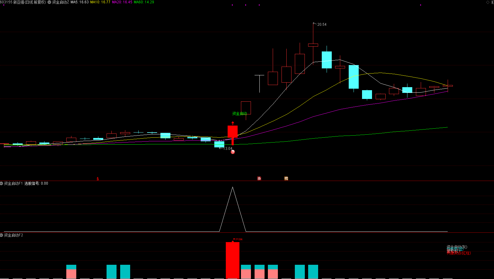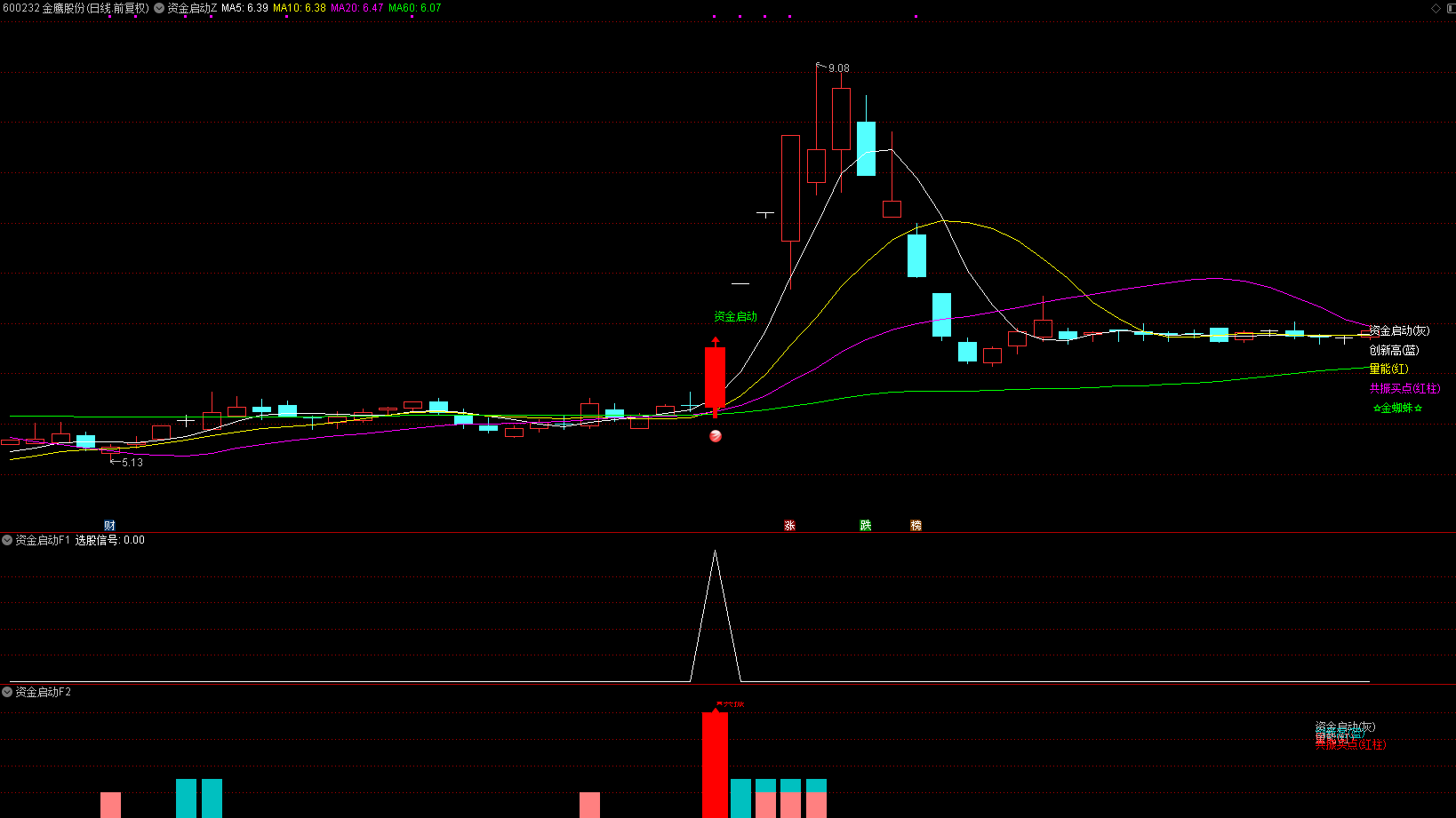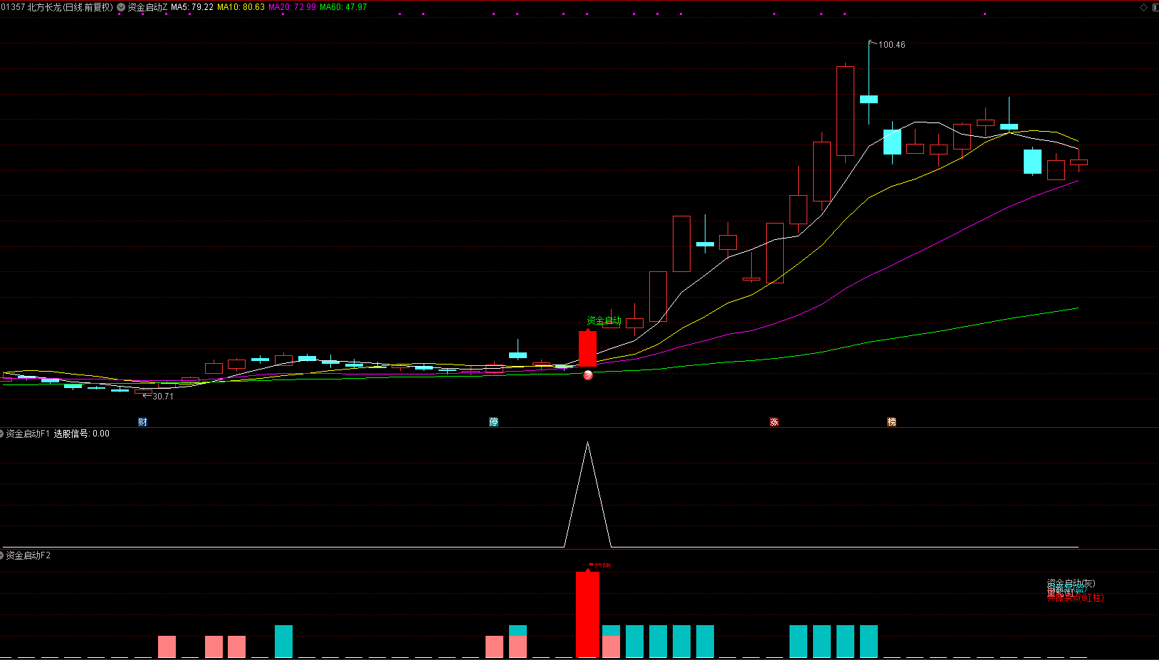 资金启动指标包含 1主图 2副图 1选股,优化一些趋势线的关系,信号数量更少。