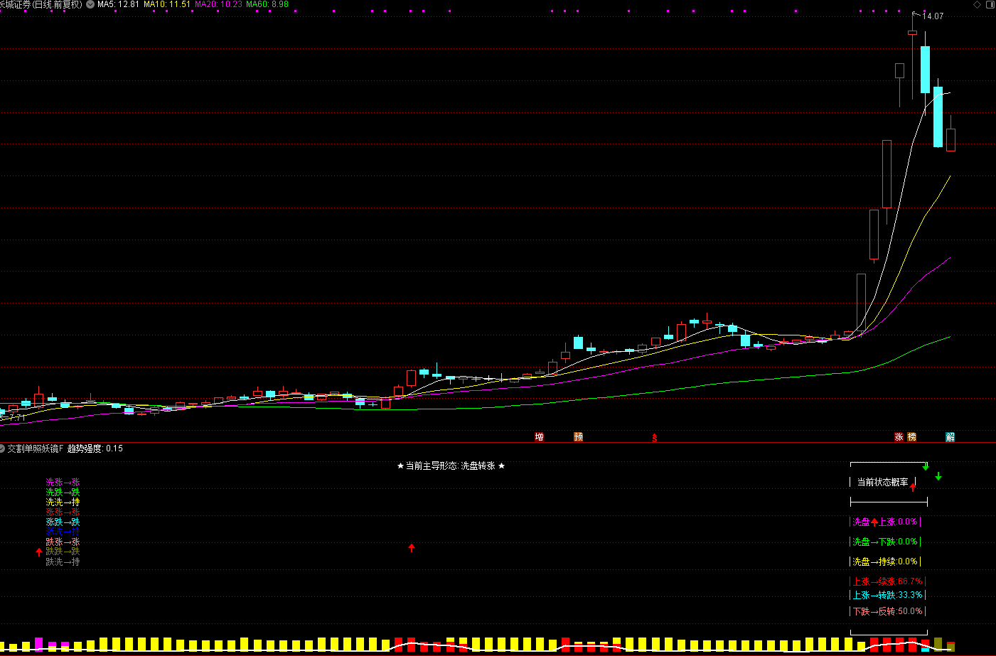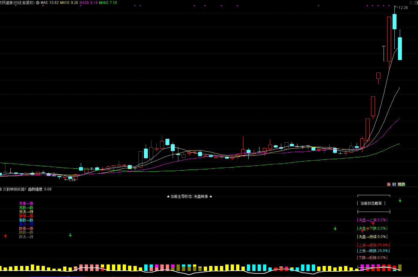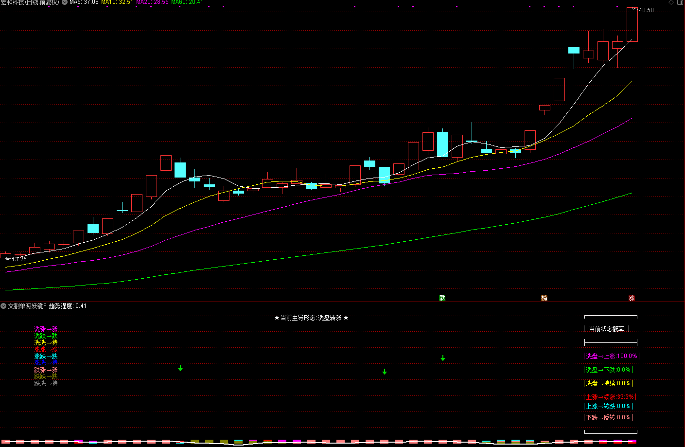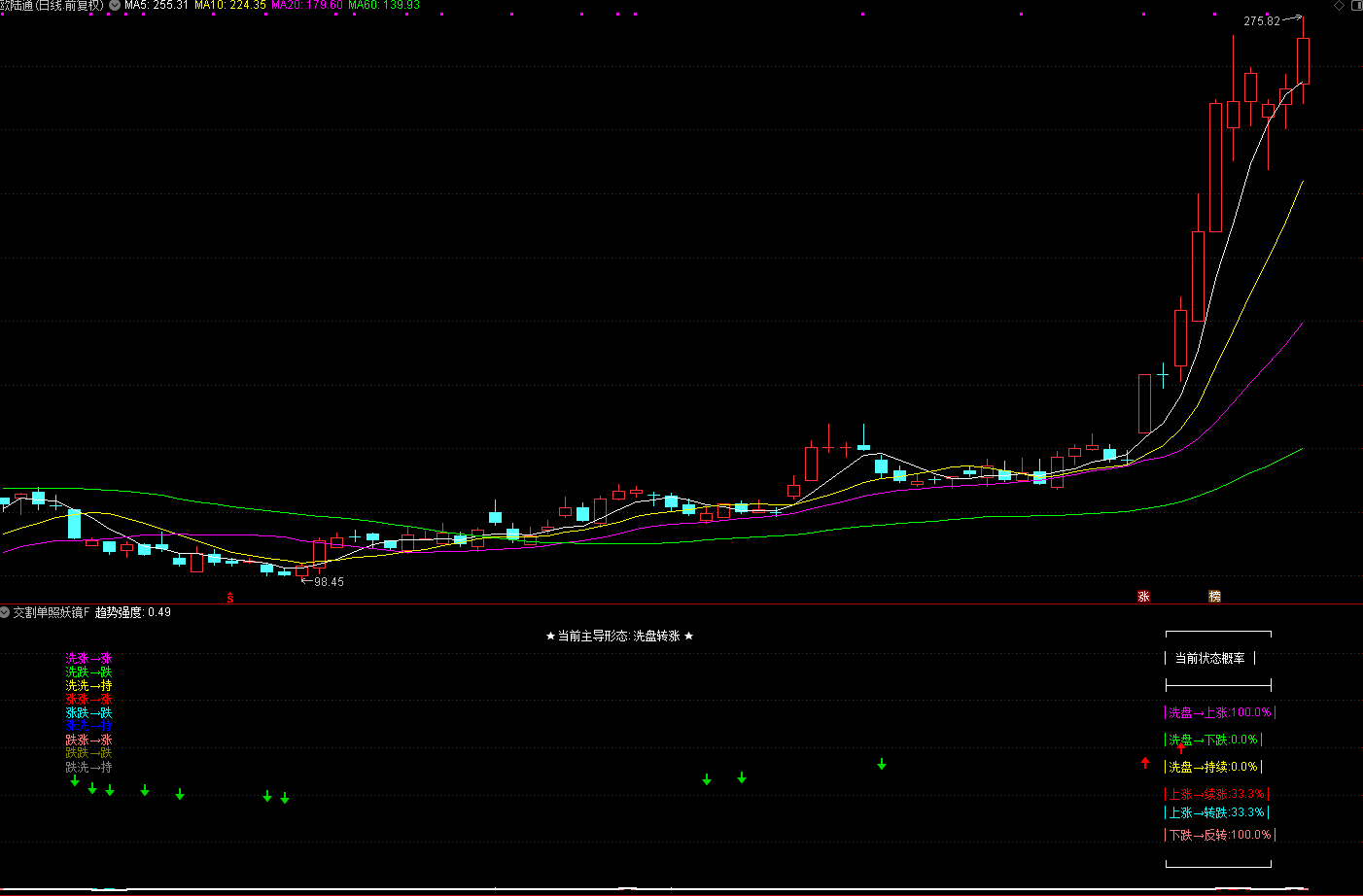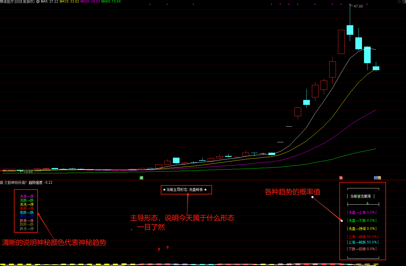 指标左边清晰用文字告诉你什么颜色代表什么趋势,右边是各种趋势的概率值,是不是很直观简单清晰?上面中间是今天主导形态,告诉你本个股今天属于什么形态,让你一目了然。