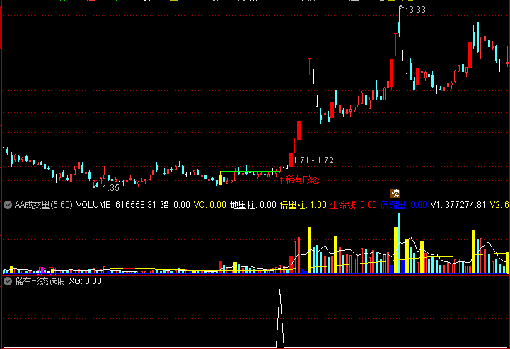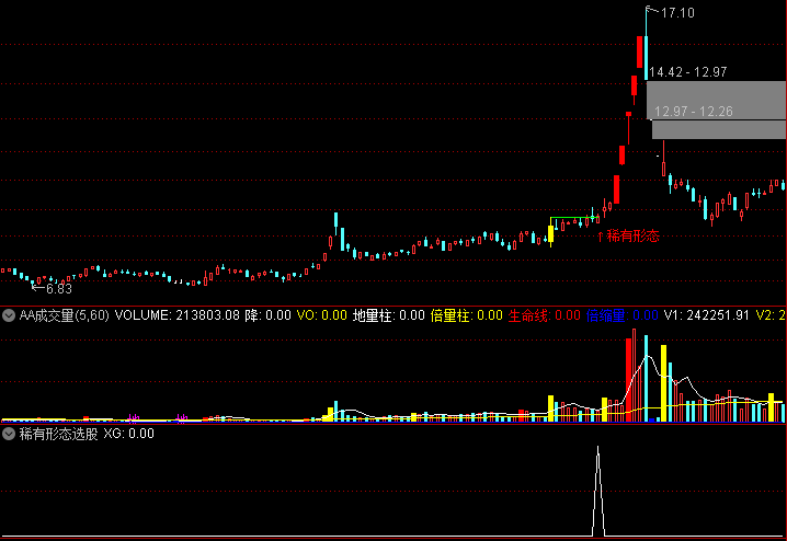 稀有形态是破前高追涨类型,形态要求极其苛刻,所以信号很少,盘中预警或尾盘使用均可,唯一缺点就是信号太少。