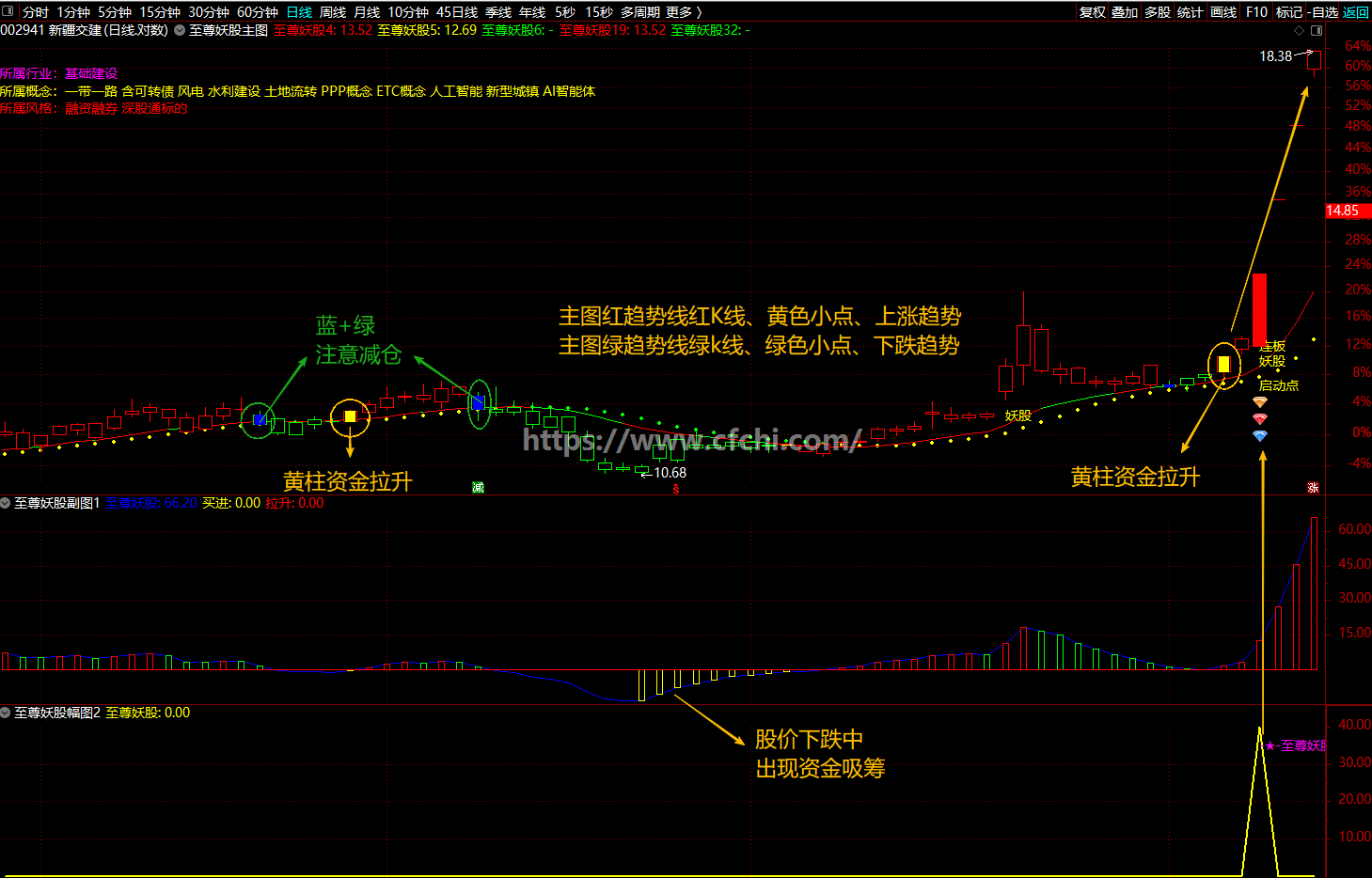 主图红色K线代表多头行情,绿色为空头,配合黄色小点及幅图红色柱判断趋势强度