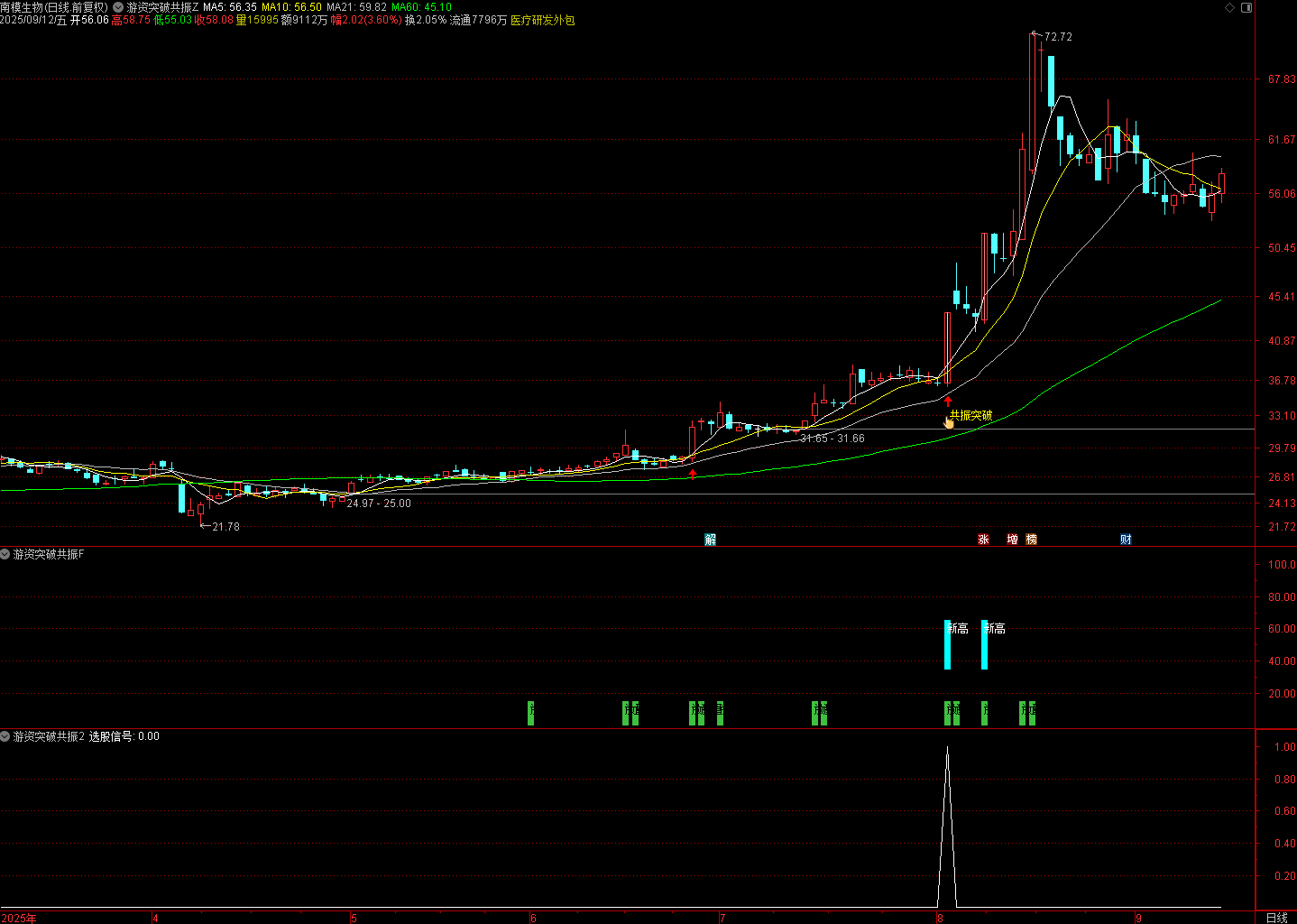 操作策略很简单:当出现红色"共振"信号(同时满足伏击和创新高条件),且绿色"放量"信号(成交量突破均线)和均线多头排列时,就是最佳买点。紫色"伏击"信号是提前埋伏机会,青色"新高"信号是趋势确认,两者叠加的红色信号最具爆发力。