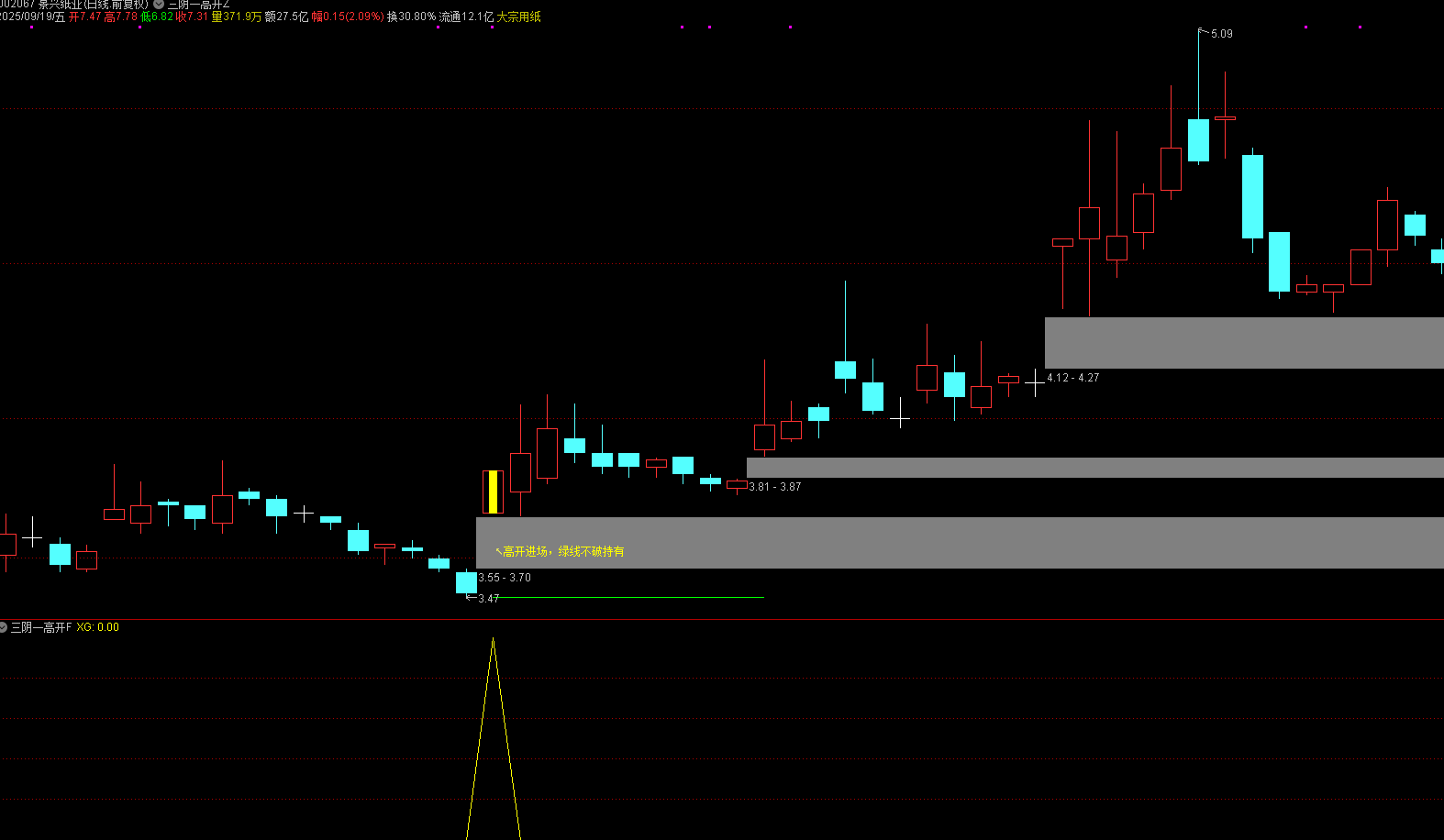 5、进场后,次日有赚可先减仓,增大利润垫,若能把成本降到绿色线以下为最佳;然后利用剩余仓位去博弈更多收益。绿色止损线不破,可持有。
