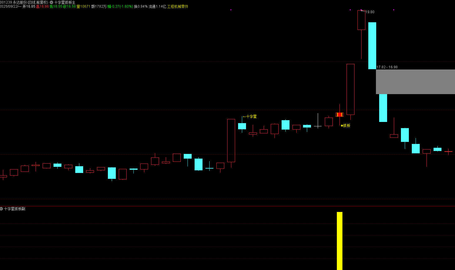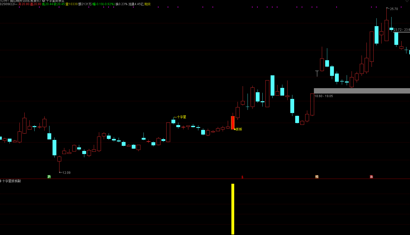 十字星抓板是主升之后的高位十字星信号为基准,开启洗盘之后再次量价配合突破压力位。