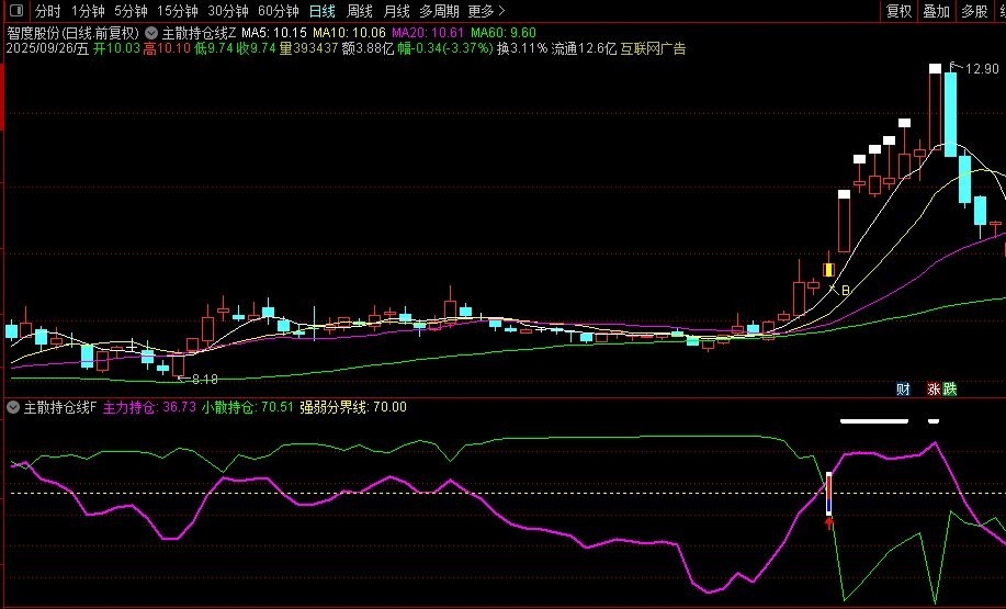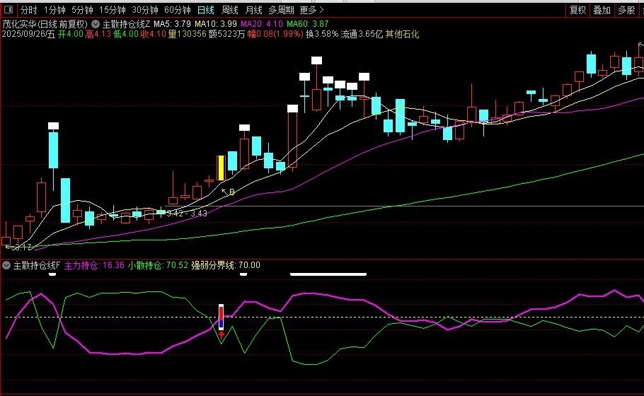 紫色曲线:主力持仓线,显示主力筹码的堆积趋势