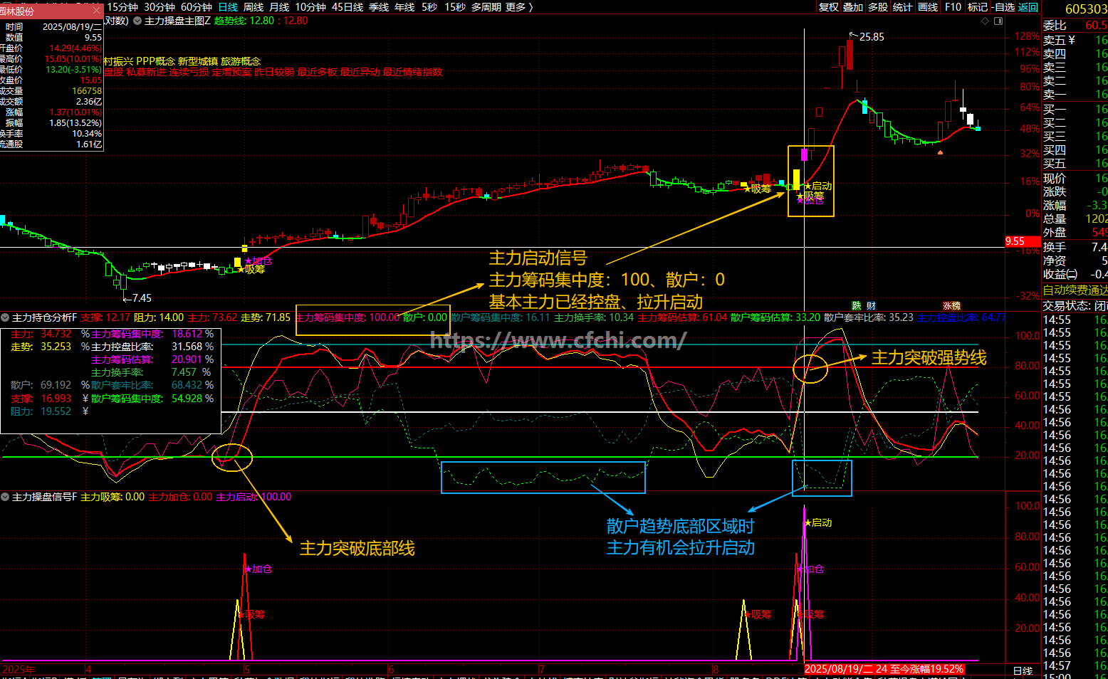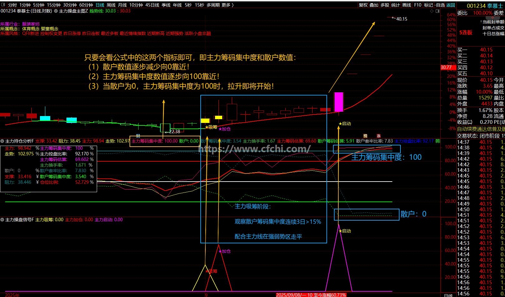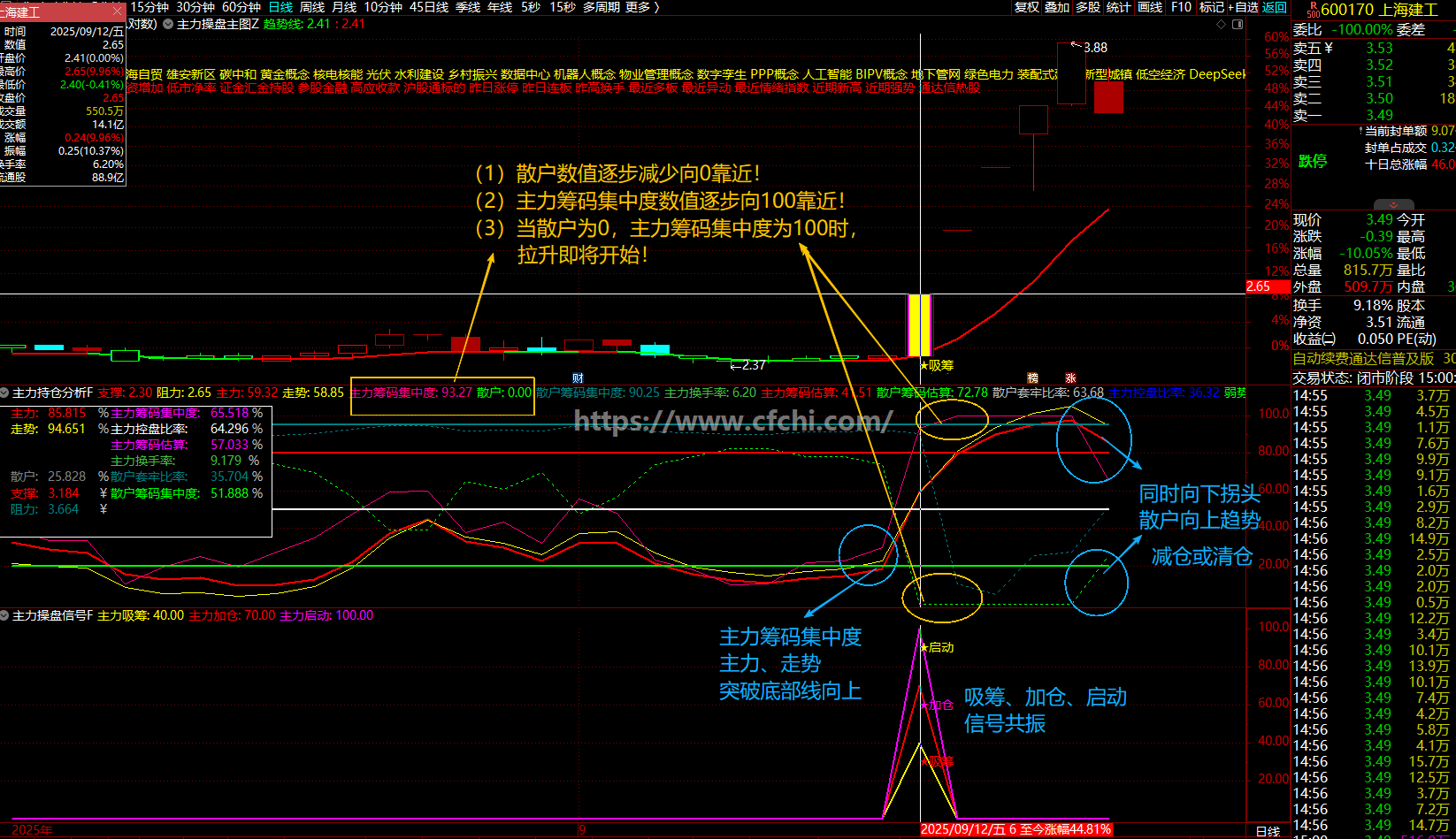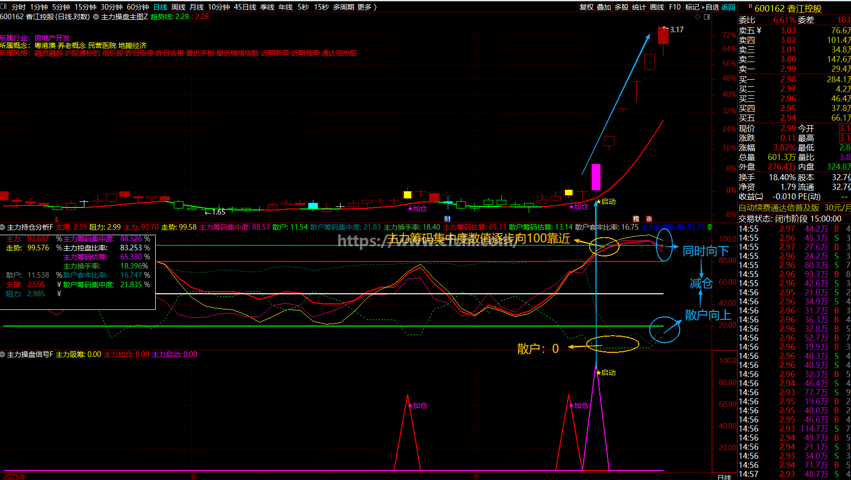 ③、当散户为0,主力筹码集中度为100时,拉升即将开始