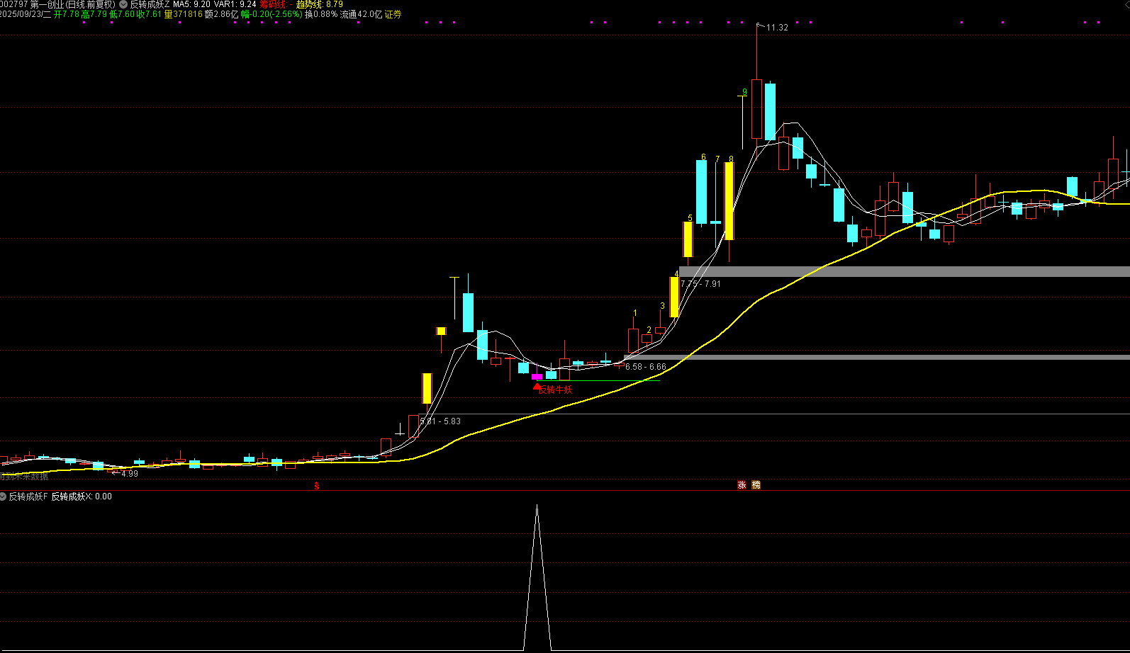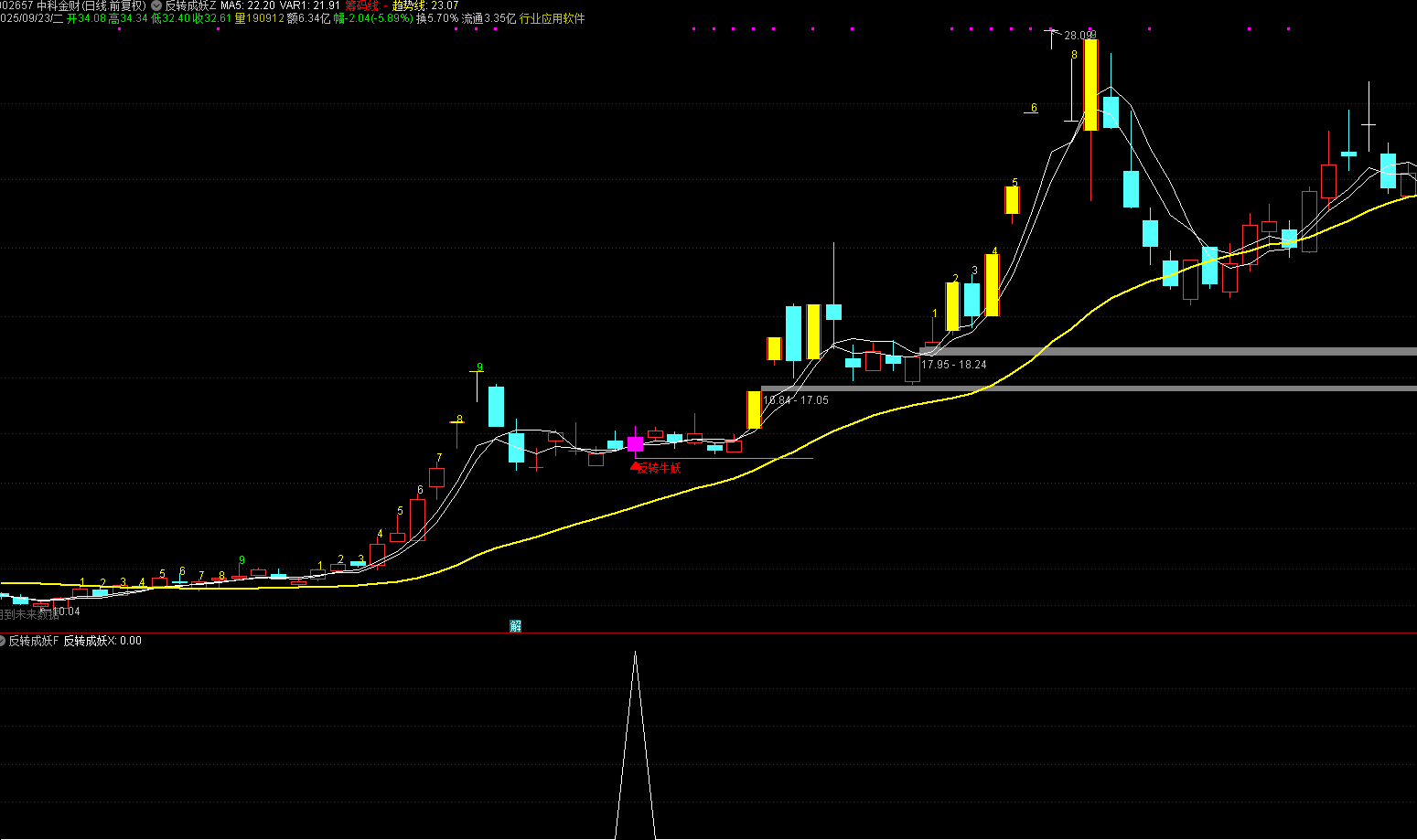 反转牛妖信号 - 当出现紫色K线柱和底部"反转牛妖"文字时,表示出现强势反转信号