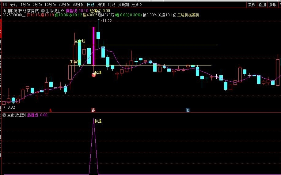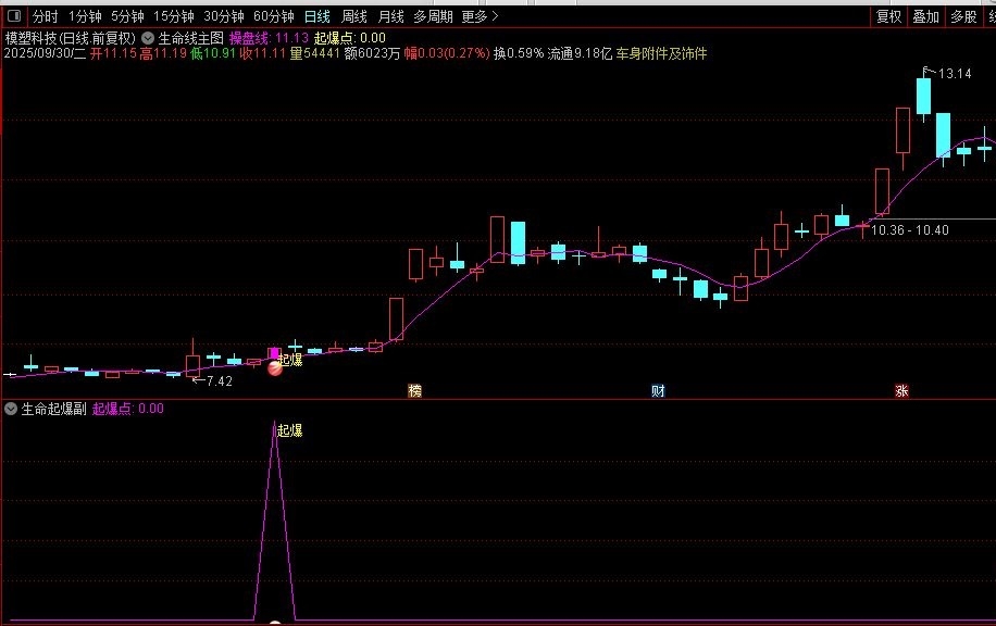 起爆点:当股价突破生命线且满足30日内有过放量信号、5日新高、涨幅未超20%等条件时,触发紫色柱状标记和文字提示。
