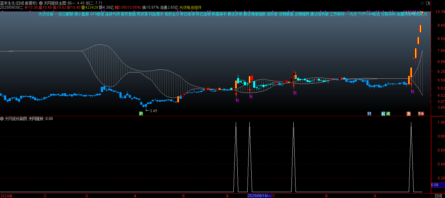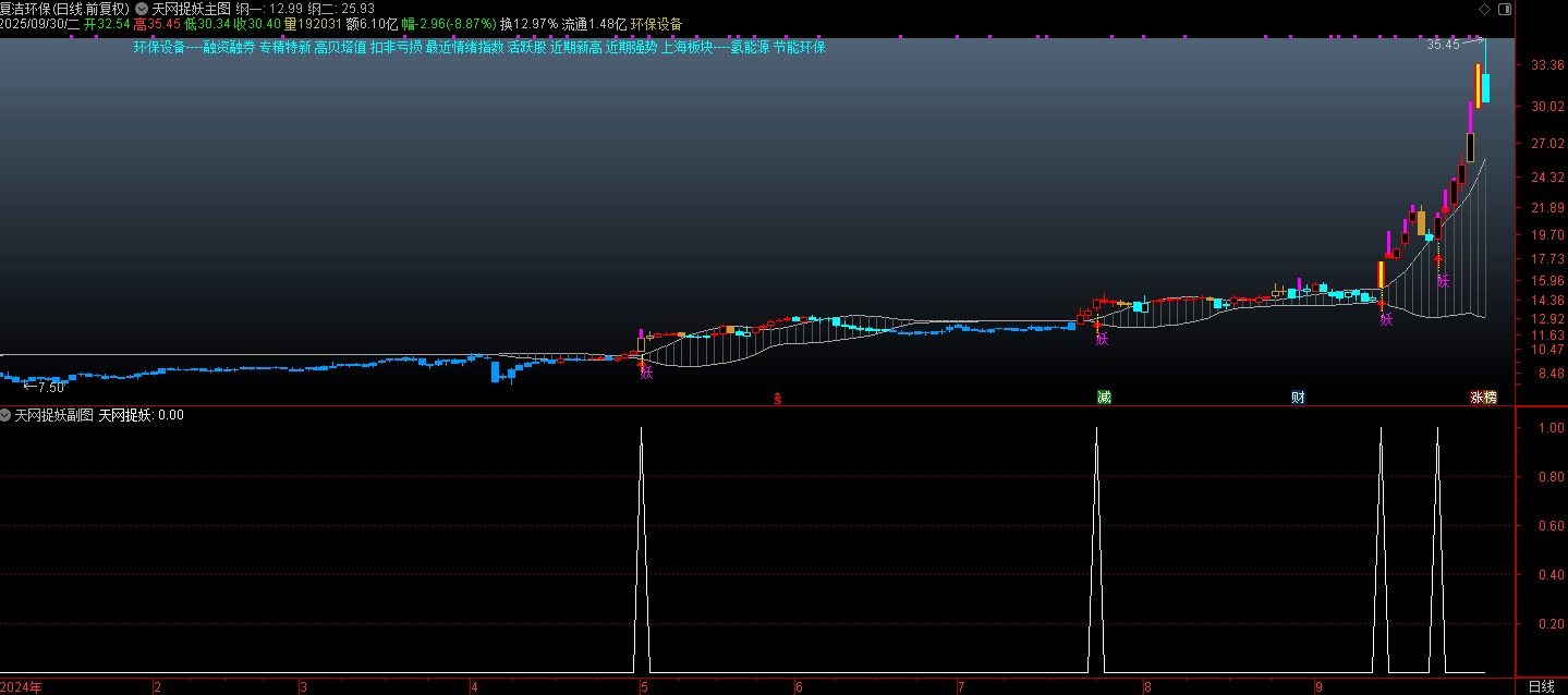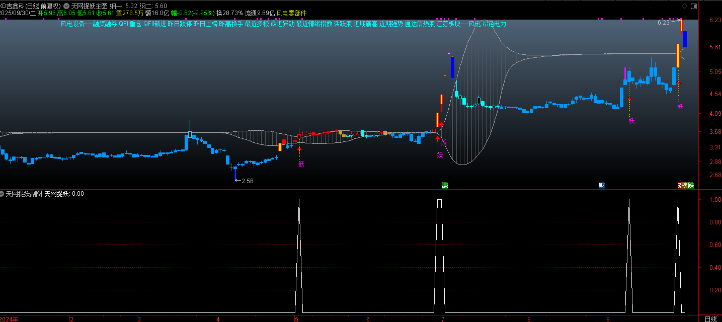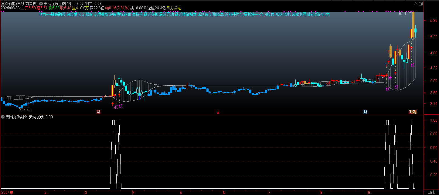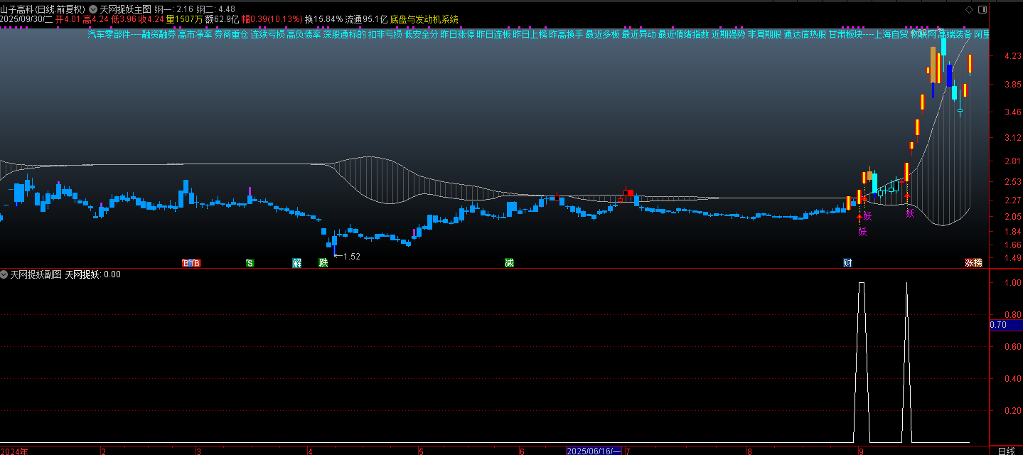 妖股信号应用:当出现 “妖” 字及黄色 K 线时,提示个股短期爆发力较强,可结合市场情绪关注,但需注意高位风险(妖股波动大)。